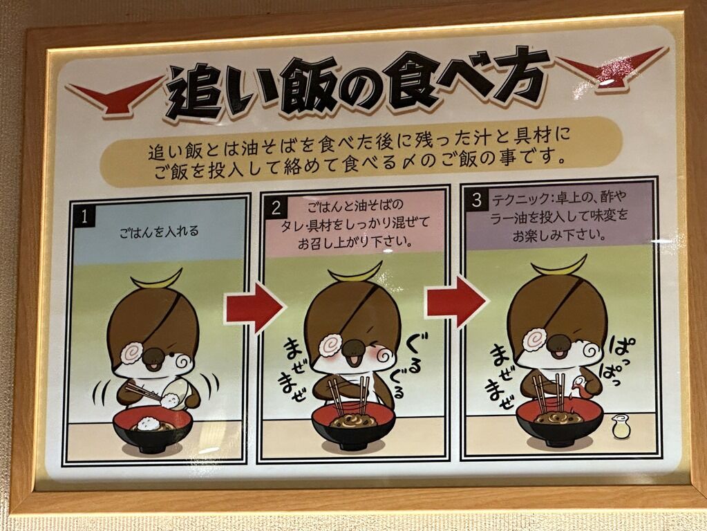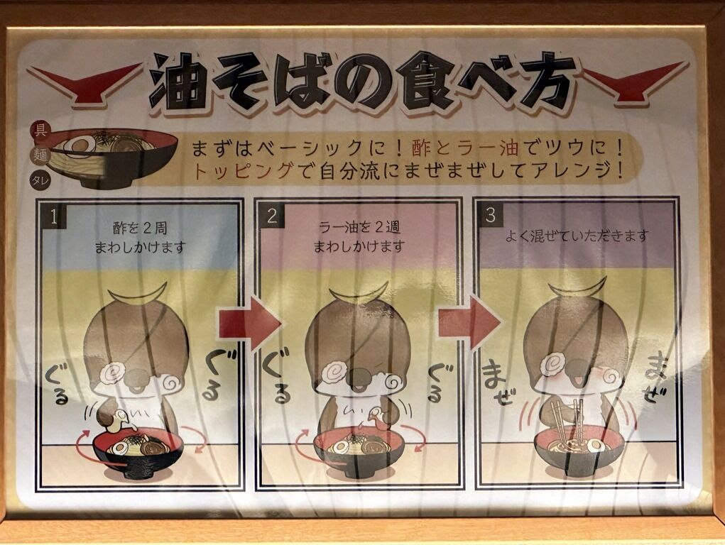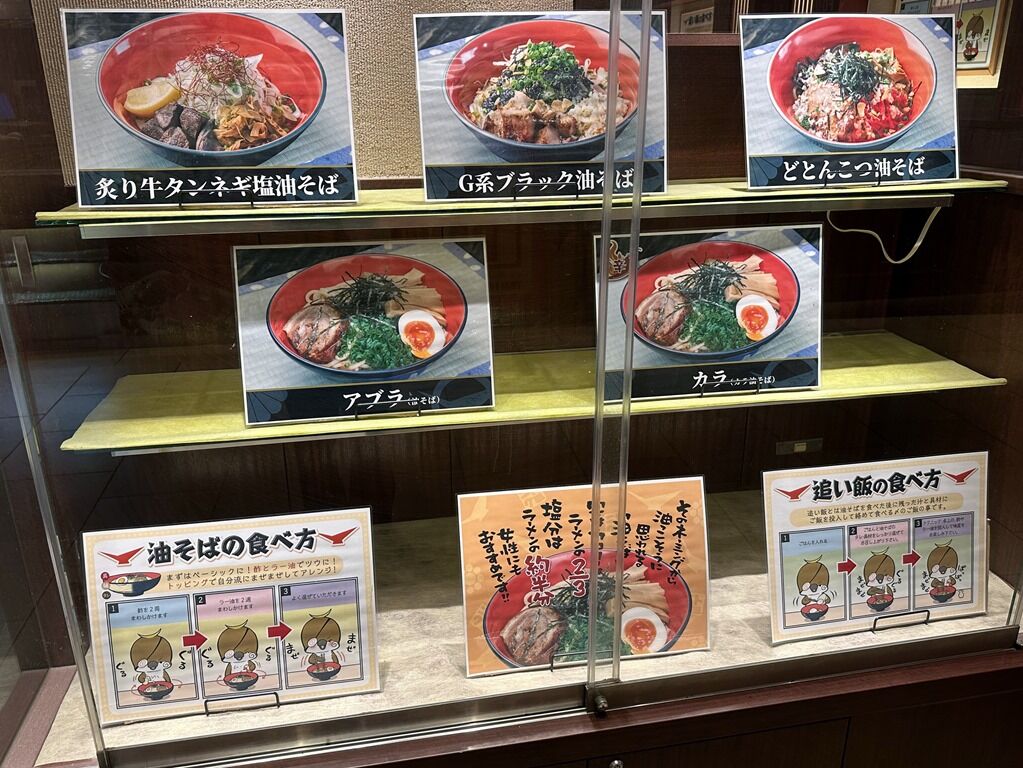 本店で一番人気のつけ麺や、新越谷でもあったラーメンの提供はなく、油そばのみのラインナップ。なお、「麺屋 政宗」の油そばは、アメリカの「ジャパン・フェス・ストリート・ラーメン・コンテスト」というラーメンフェスにて、マンハッタン&クイーンズでダブル優勝とのこと。