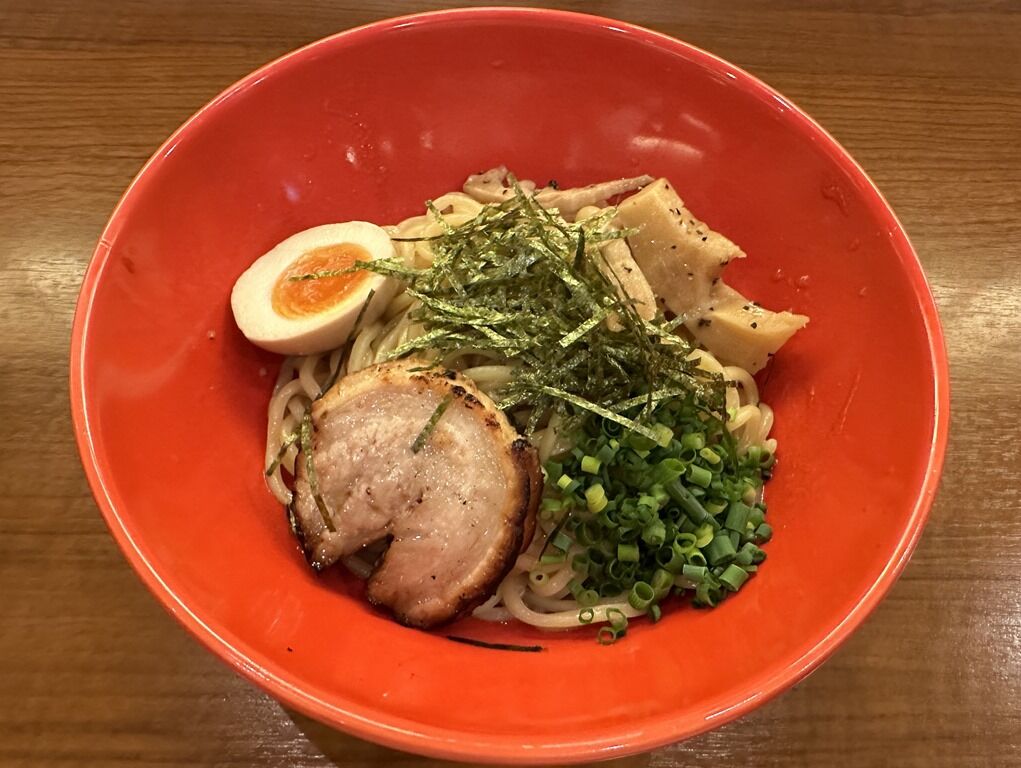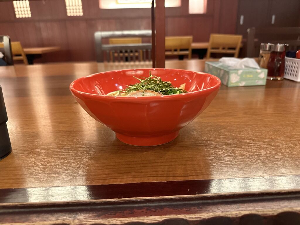 鮮やかな赤がまぶしいラーメン鉢型の器で着丼。