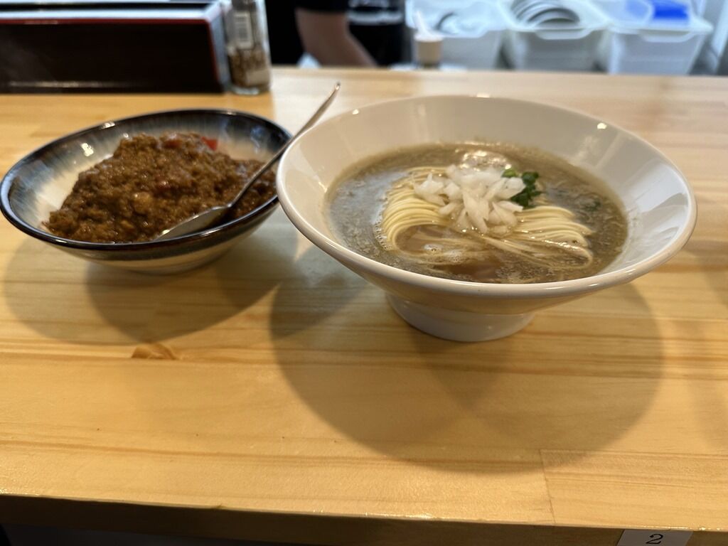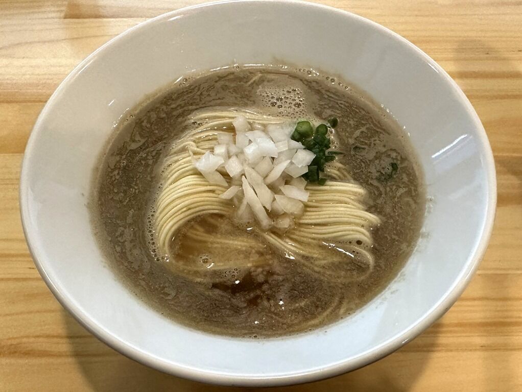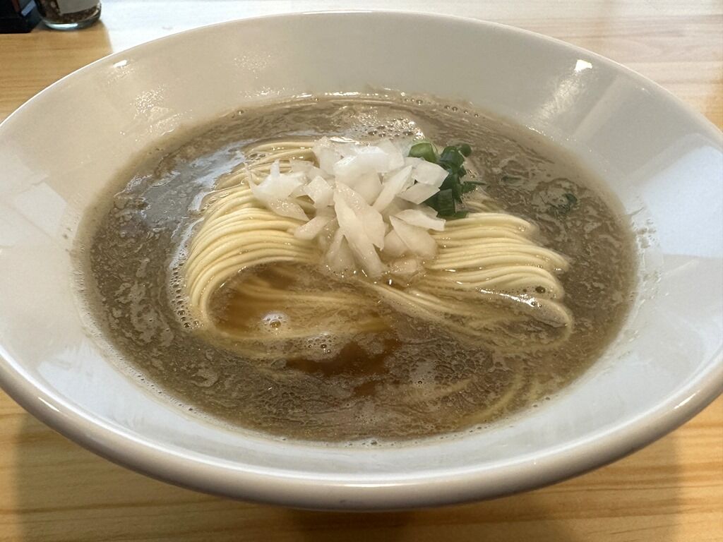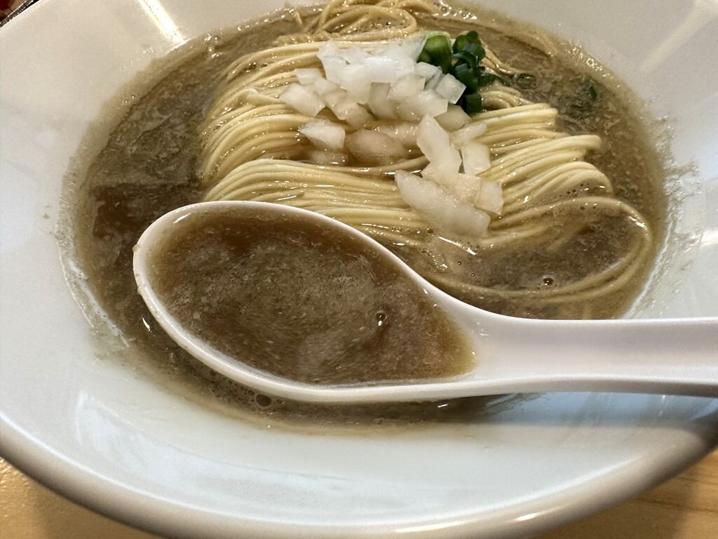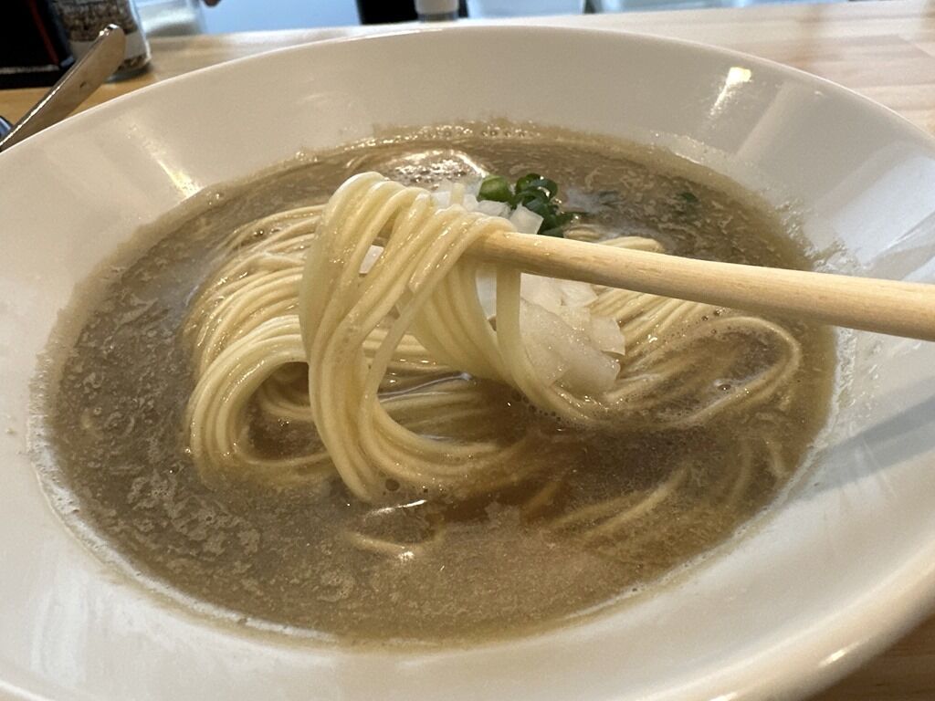 セメントカラーのスープはさらさらの煮干味。一口目で思わず旨い!と声が出ちゃいました。クリアでシャープでキレとコクが両立した、ラジカルでストレートなニボい味わい。朝から列んで良かったと心底思える味ですごく美味しい!