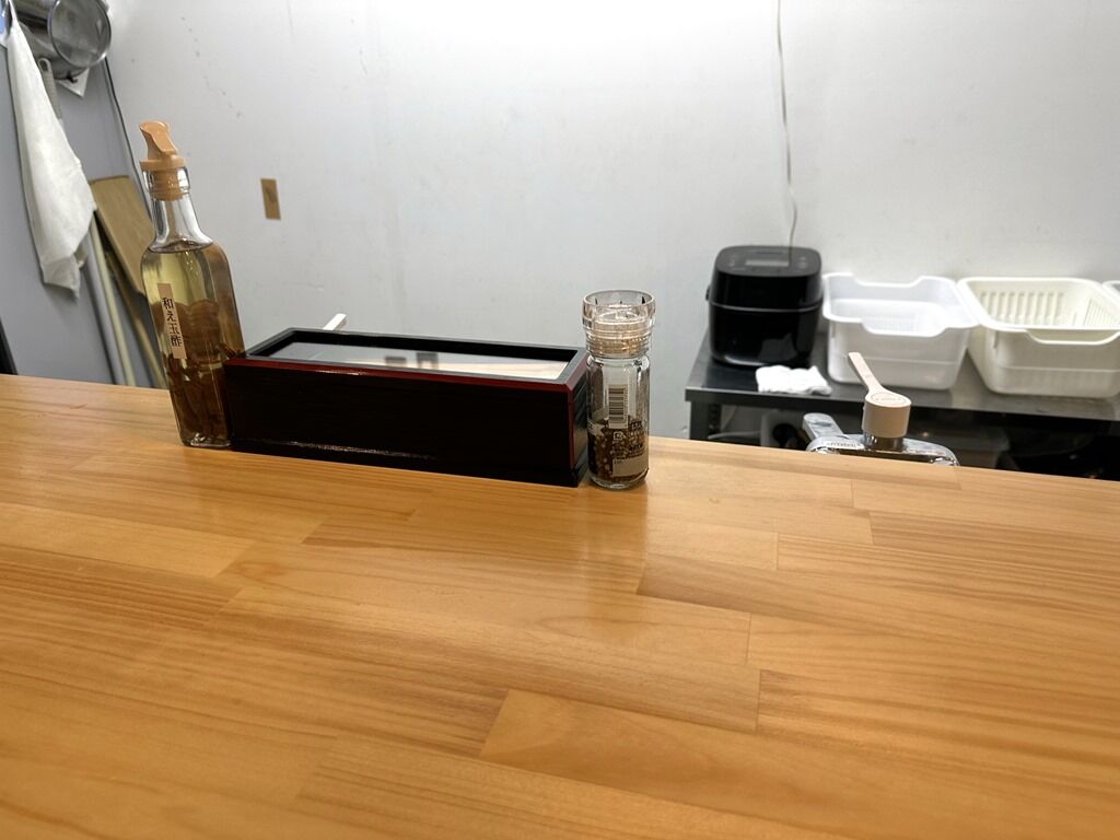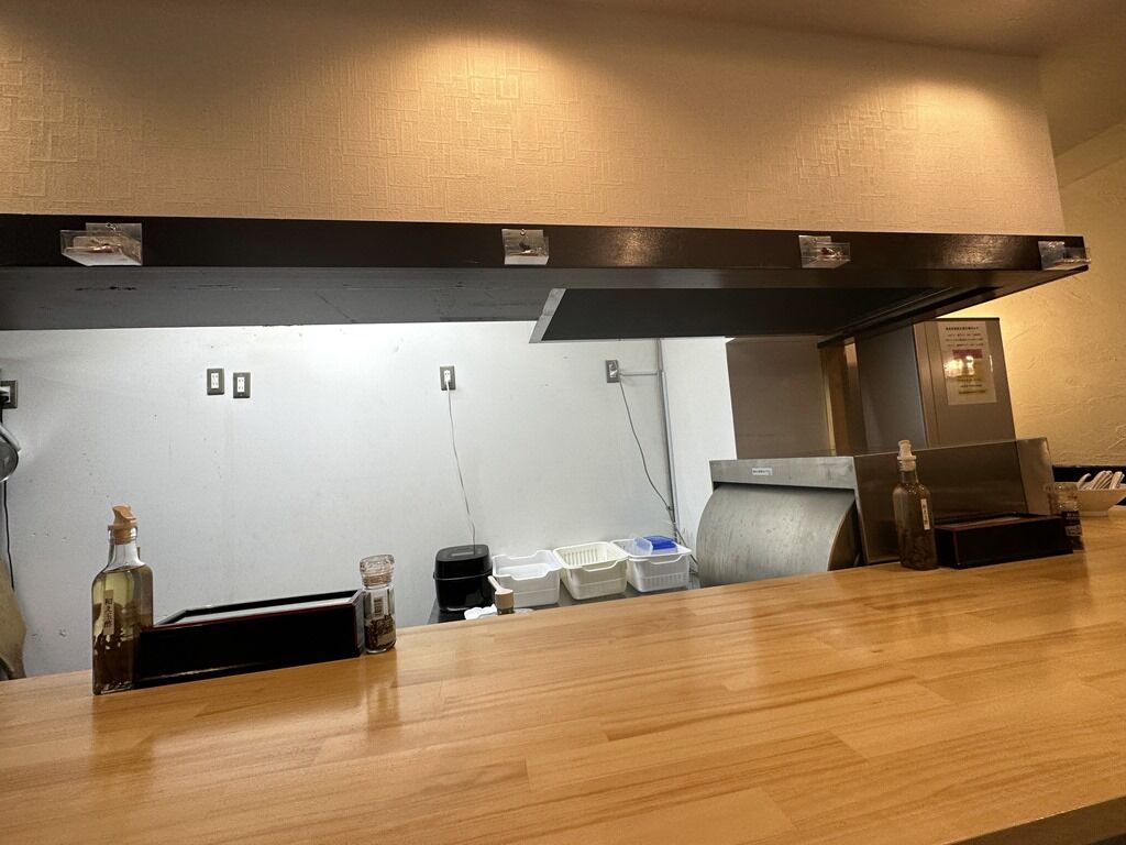 スタッフは店主さん、店長さん含め4名。店主さんにすぐ気づいていただいて、どうもおめでとうございます!BGMはFM JWAVE。箸は割り箸。卓上調味料は和え玉酢、ペッパーミル入り粒黒胡椒。