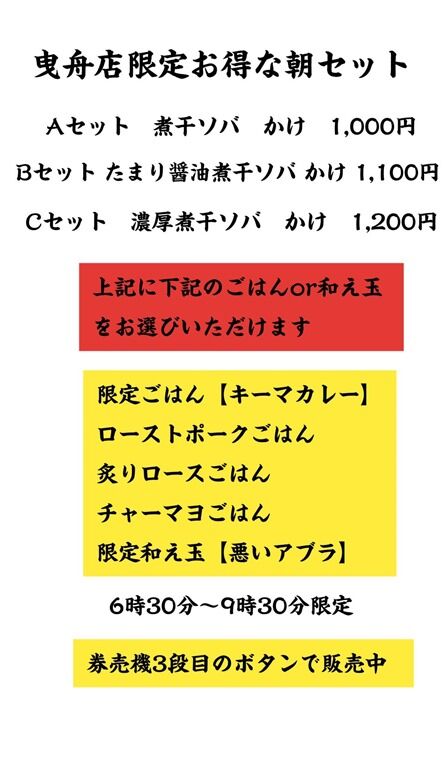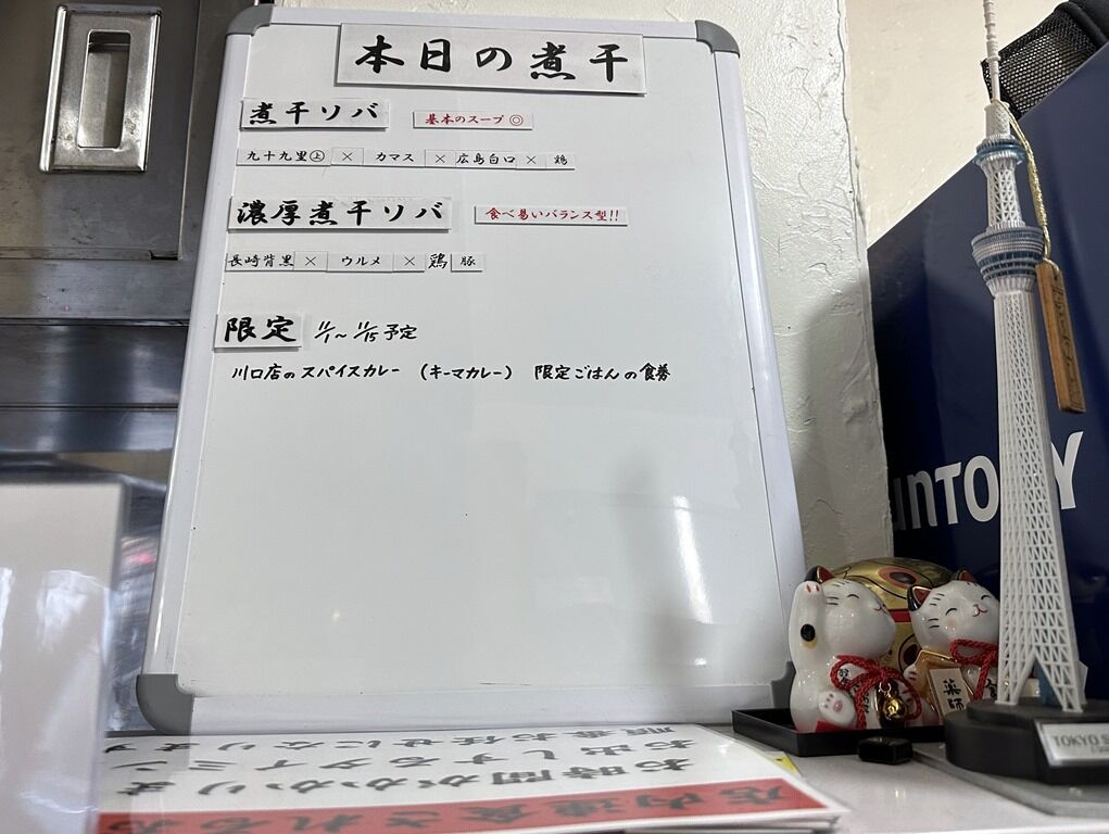 主なメニューは、特製煮干ソバ1400円、特製濃厚煮干ソバ1500円、Aセット 煮干ソバかけ1000円、Bセットたまり醤油煮干ソバかけ1100円、Cセット濃厚煮干ソバかけ1200円、他。