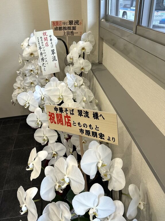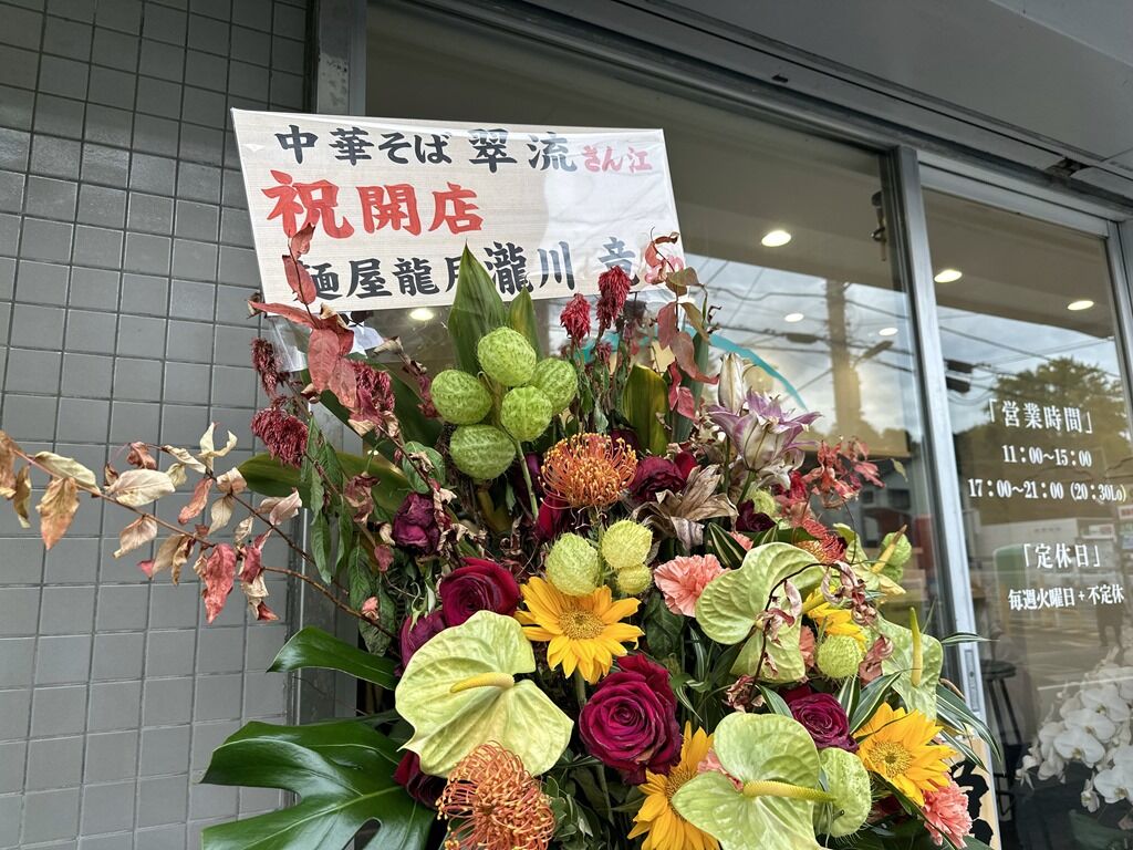 店の場所は市川大野駅徒歩約1分。中国料理菜王→本格中華成和と入れ替わった跡地。店頭開店祝花は麺屋龍月から。オープン直後は柏濃麺や39名からの花もあった様です。