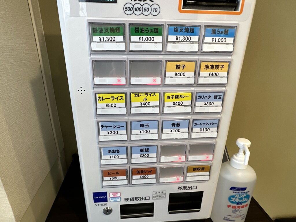 入店するとまずグローリー商事製VT-S20ボタン式券売機で食券購入です。主なメニューは、醤油らぁ麺1000円、塩らぁ麺1000円、餃子400円、ガリバタ替玉300円、カレーライス小400円、他。