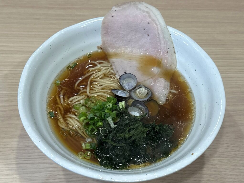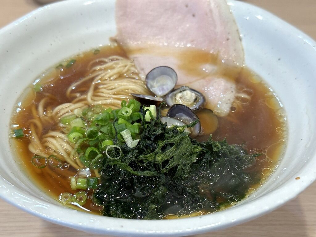 具は、あまり火が通らない様に器の縁の立てかけられた低温調理のチャーシュー、殻付きしじみ、あおさ、きざみ青ねぎ。