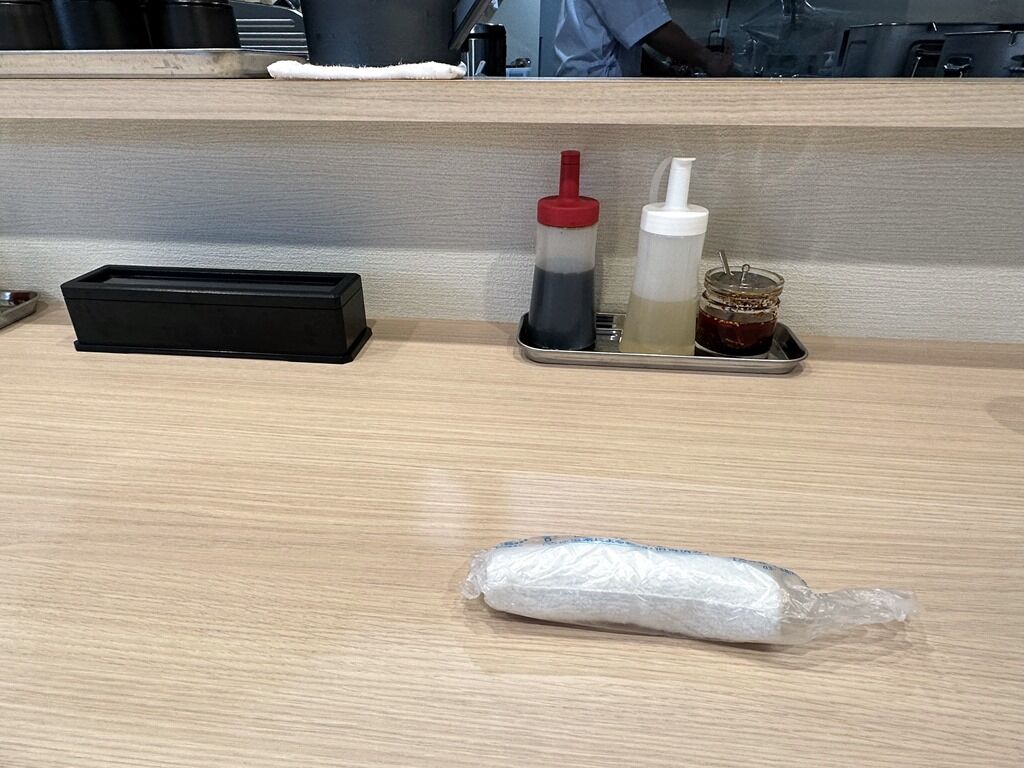 店内は厨房を囲むL字型カウンター8席(5・3)。13:50頃到着で先客4、後客4。