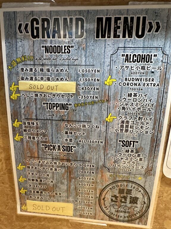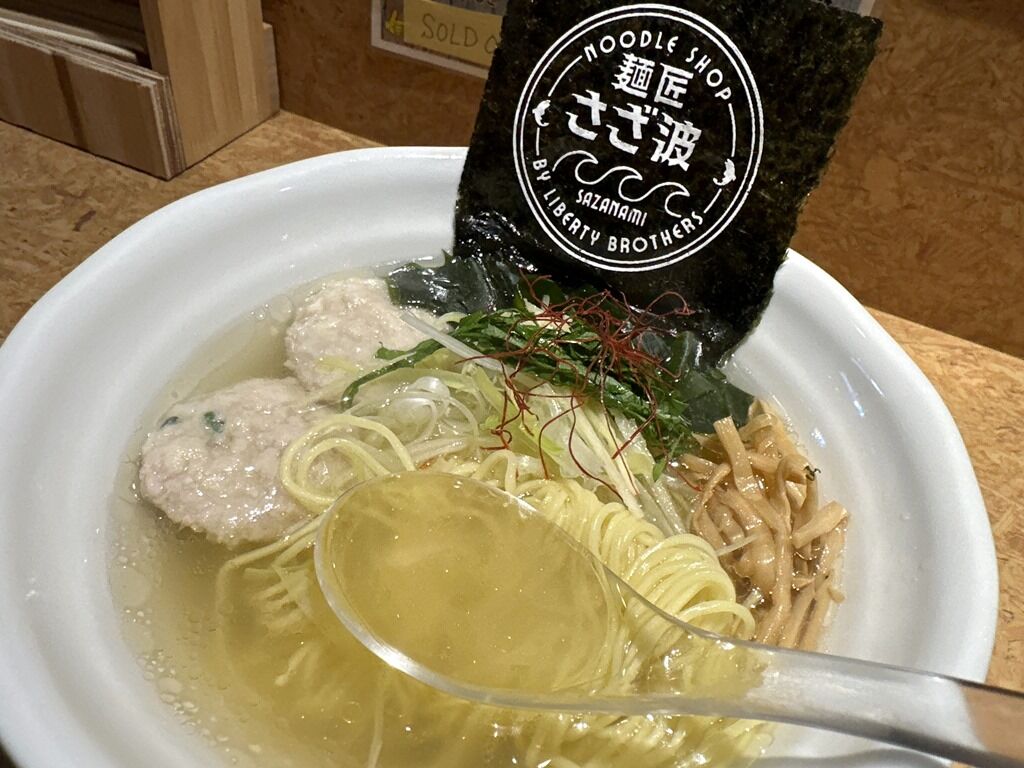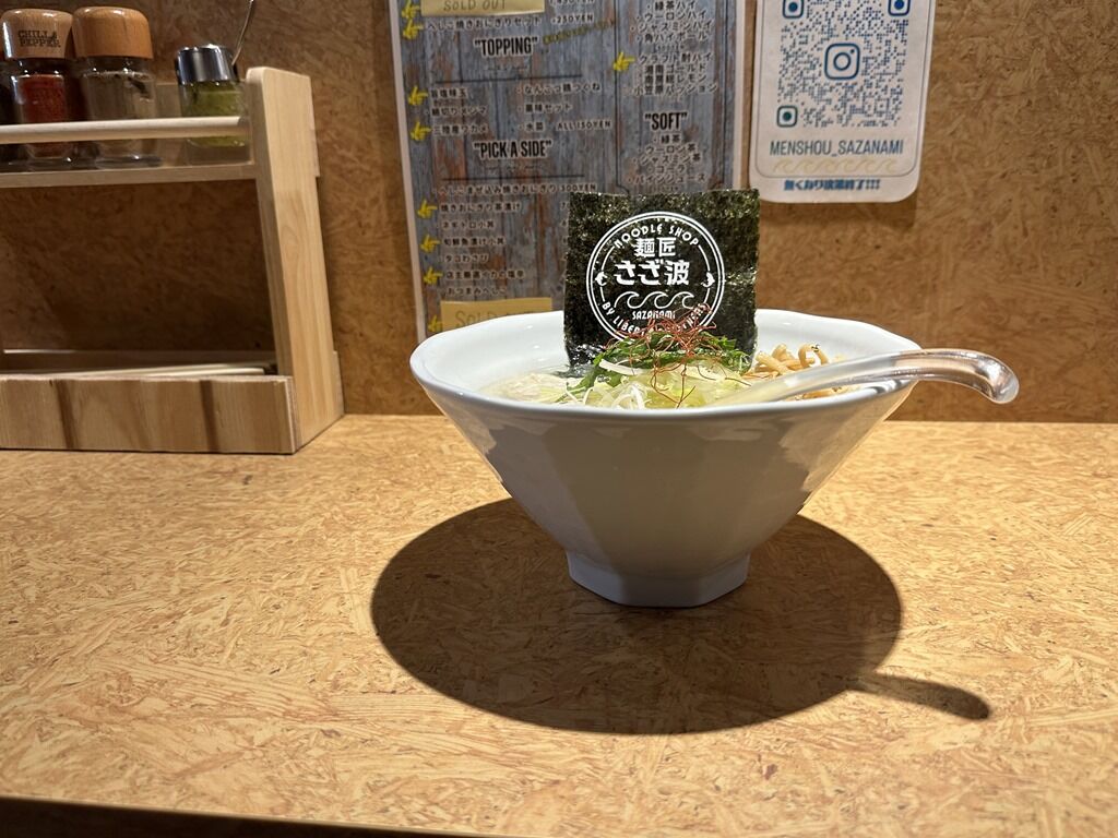 「ヘしこ焼きおにぎり」でググると、「麺屋海神」とそちらの看板メニュー「あら炊き塩らあめん」がヒットします。こちら「さざ波」も鮮魚らーめんなので、なにか関連があるのでしょうか?