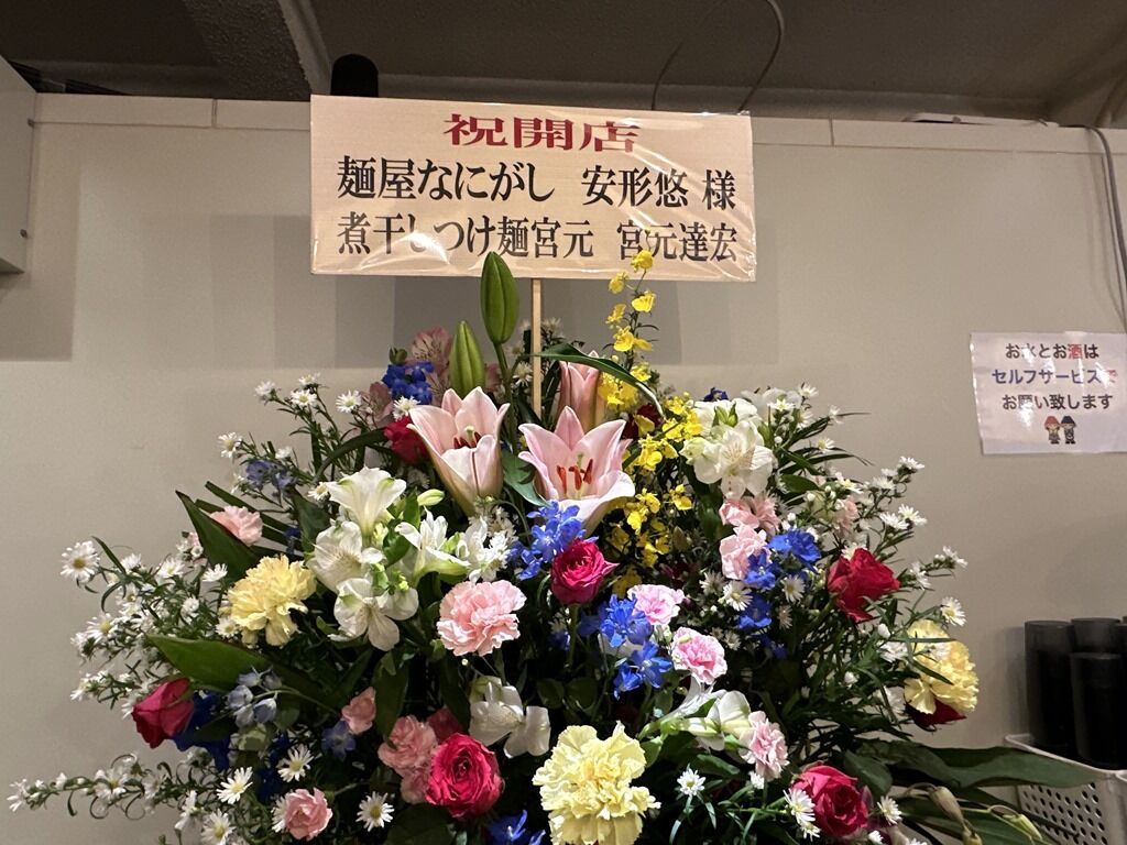 店内は厨房前に真っ直ぐなカウンター6席。中待ち席2席。通常は5名中待ちさせる様ですが、花があるためこの日は中待ち4名まで。その店内開店祝花は、煮干しつけ麺 宮元から。