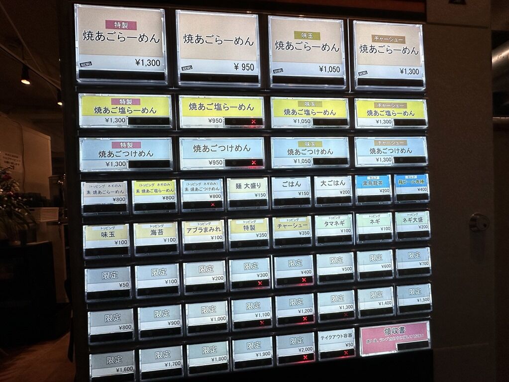 主なメニューは、焼きあごラーメン950円、焼きあご塩ラーメン950円、焼きあごつけめん950円、他。初日のこの日は醤油のみの提供で、塩・つけめんは準備中。