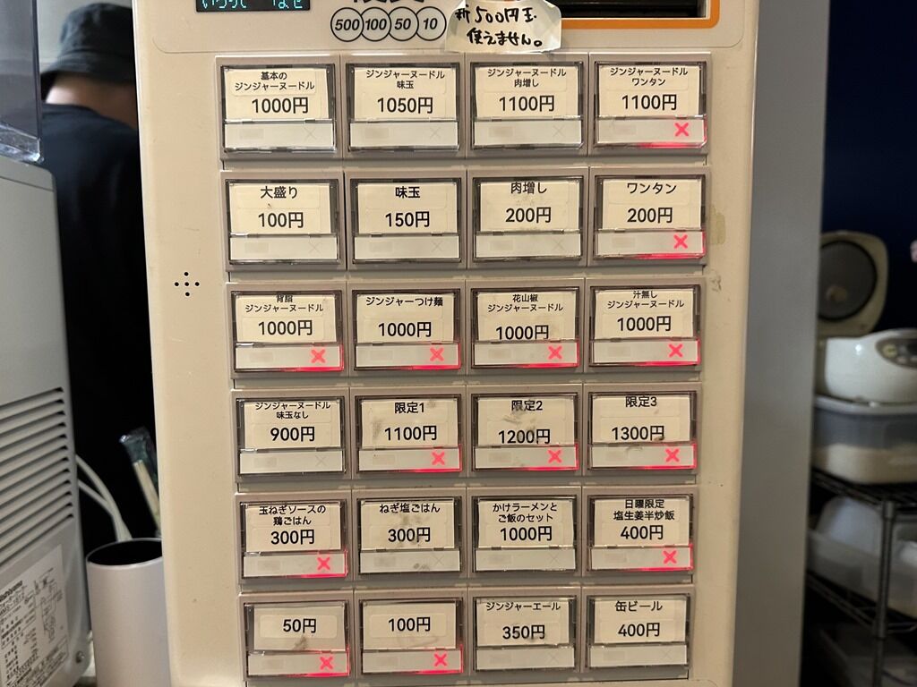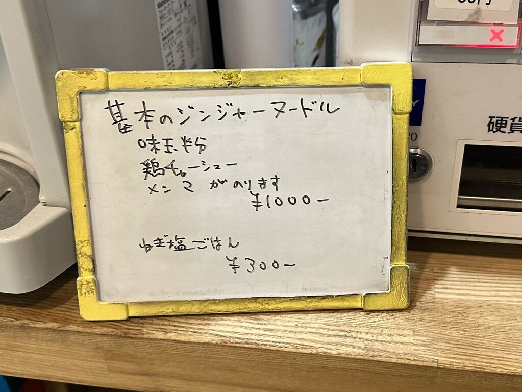 入店するとまず券売機で食券購入です。主なメニューは、基本のジンジャーヌードル・背脂ジンジャーヌードル・ジンジャーつけ麺・花山椒ジンジャーヌードル・汁無しジンジャーヌードル 各1000円、ねぎ塩ご飯300円、他。