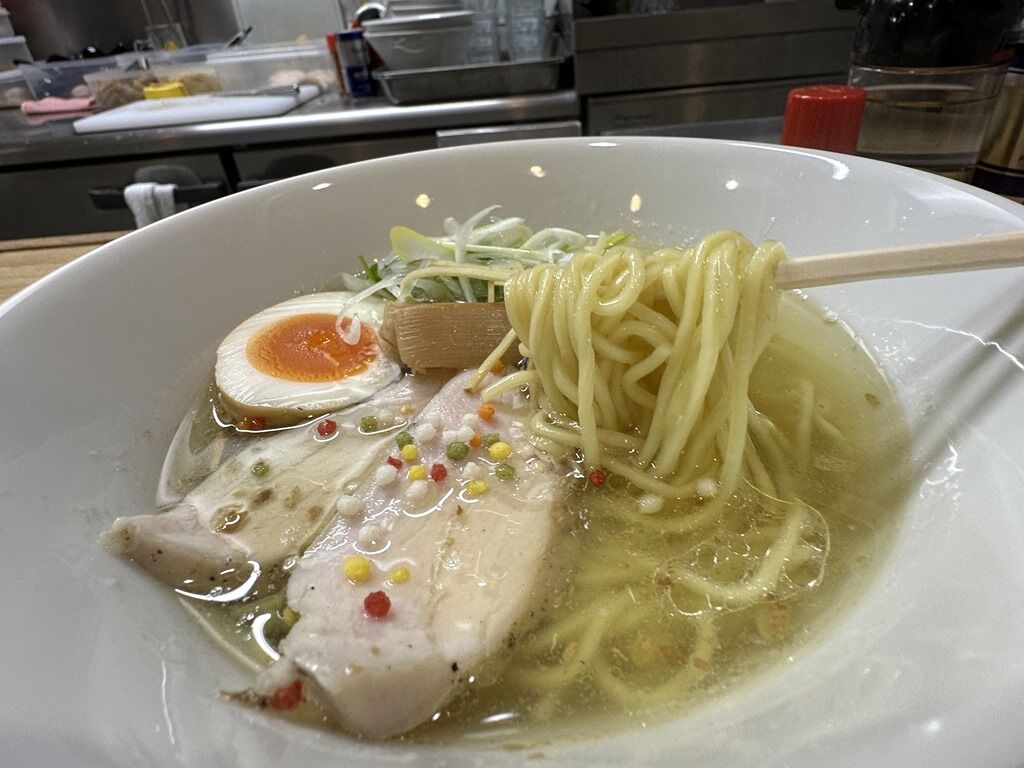 スープはさらさらの清湯塩味。鶏スープにガッツリ生姜。MANNISHの「塩生姜らー麺」をベースにしながら随所に渡ってブラッシュアップを重ねてファインチューニングを施した印象。鶏出汁塩生姜味の一つと到達点と呼びたいポテンシャル。沁み渡る生姜フレーバー&テイストですごく美味しい!