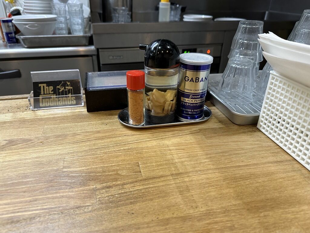 BGMはポップス。箸は割り箸。卓上調味料はGABANブラックペッパー、辛味粉は七味ではなく生姜入り自家製八味唐辛子。