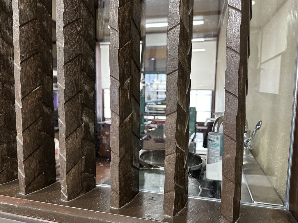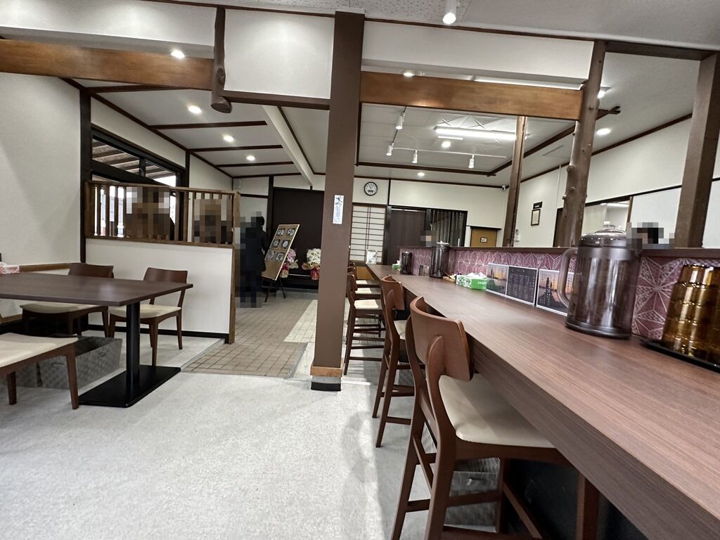 スタッフは厨房・ホールに男女合わせて4。厨房向かって左奥にお手洗い、その手前にガラス窓から中が見える製麺室。各席足元に荷物かご用意あり。