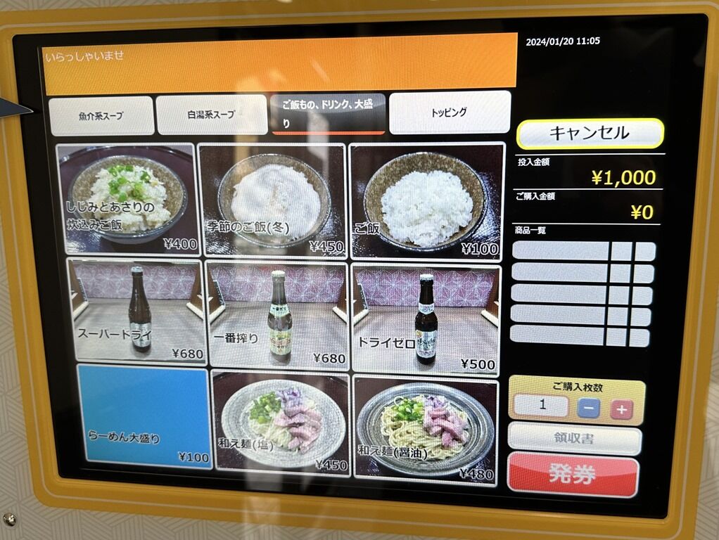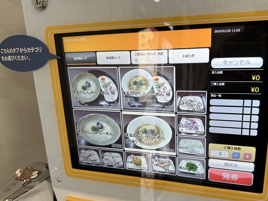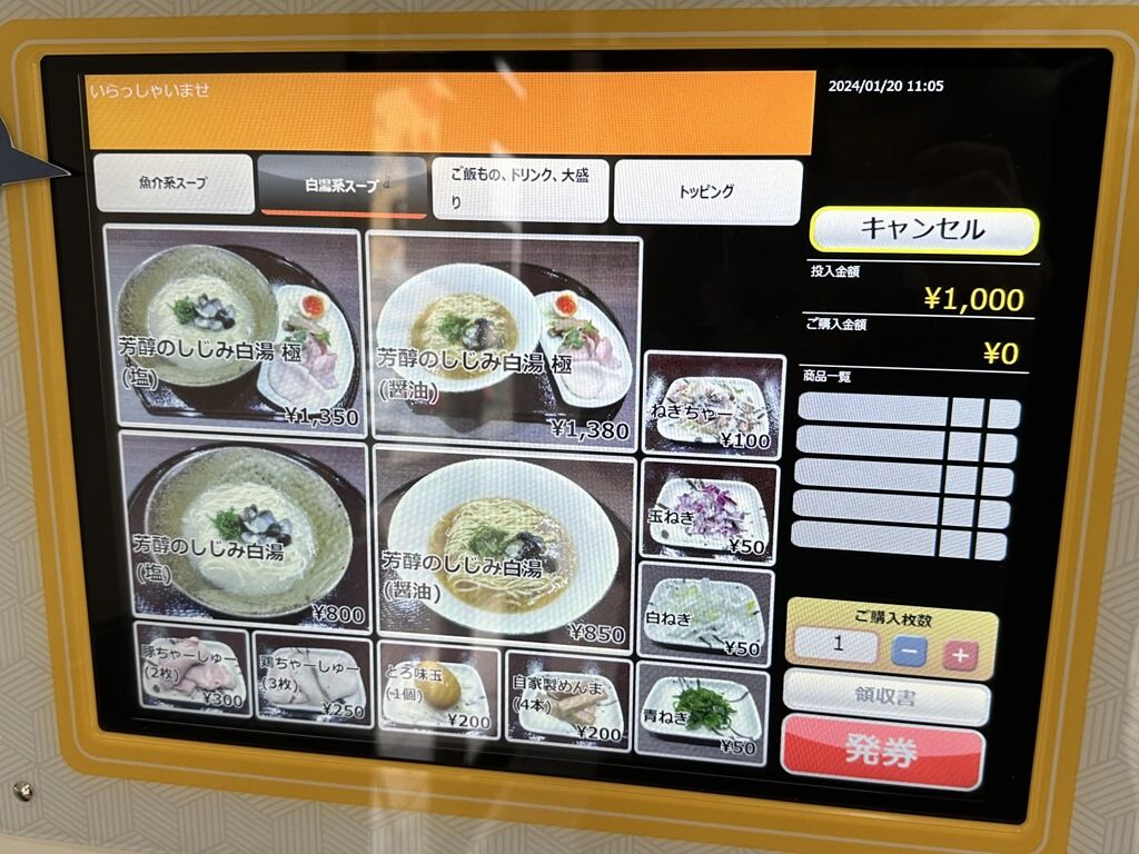 定刻5分前到着で一番海苔~w 開店前で外待ちしててもしじみの香りが香ってきます。1分遅れでオープン。入店するとまずタッチパネル式券売機で食券購入です。