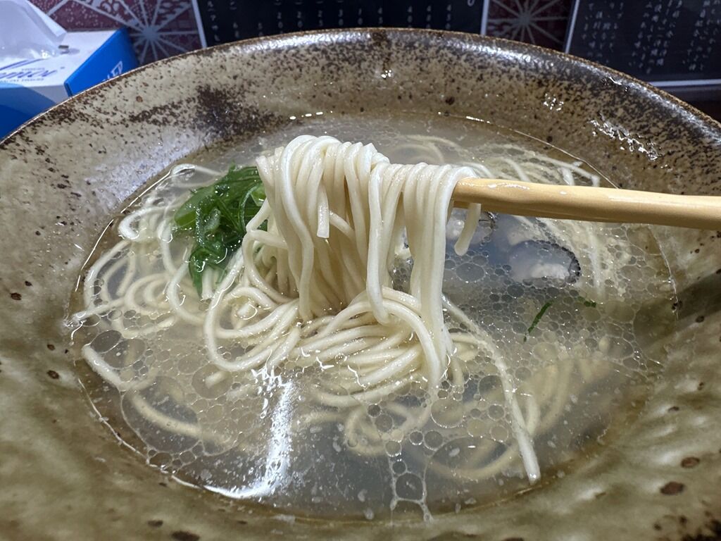 スープはさらさらの清湯塩味。宍道湖産ヤマトシジミ100%使用のピュアしじみスープ。塩は沖縄県産ぬちまーす。しみじみと沁み入るまさに滋味溢れる味わい。心なしか、傷んだ胃や肝臓が浄化されていくような気が。コハク酸とオルニチンの旨味と効能が体感実感できる味で実に美味しい!