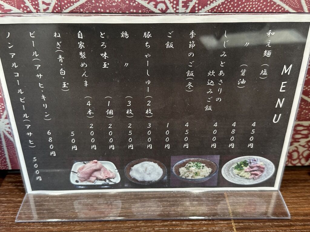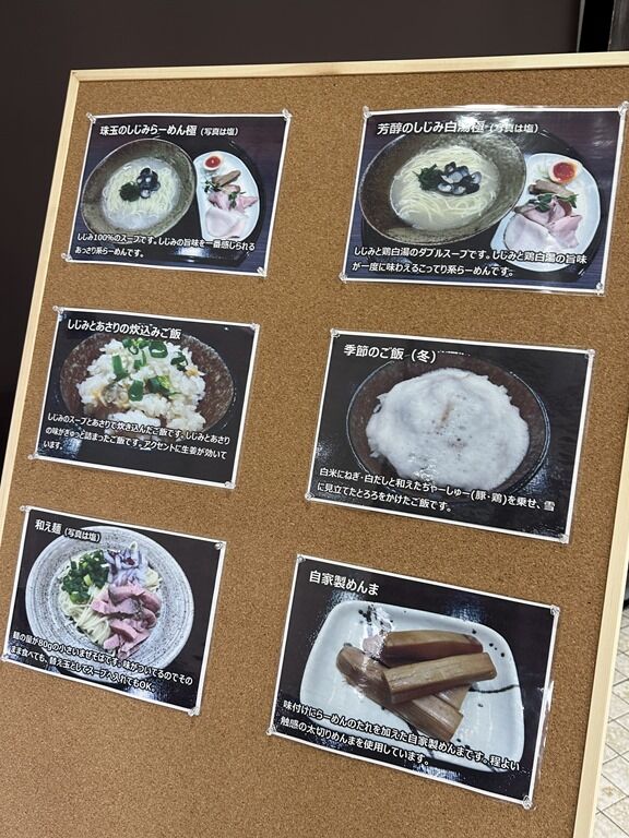 主なメニューは、珠玉のしじみらーめん(塩)750円、珠玉のしじみらーめん(醤油)780円、芳醇のしじみ白湯(塩)800円、芳醇のしじみ白湯(醤油)850円、和え麺(塩)450円、和え麺(醤油)480円、しじみとあさりの炊き込みご飯400円、季節のご飯(冬)450円、他。