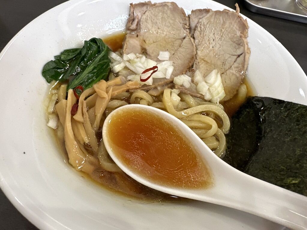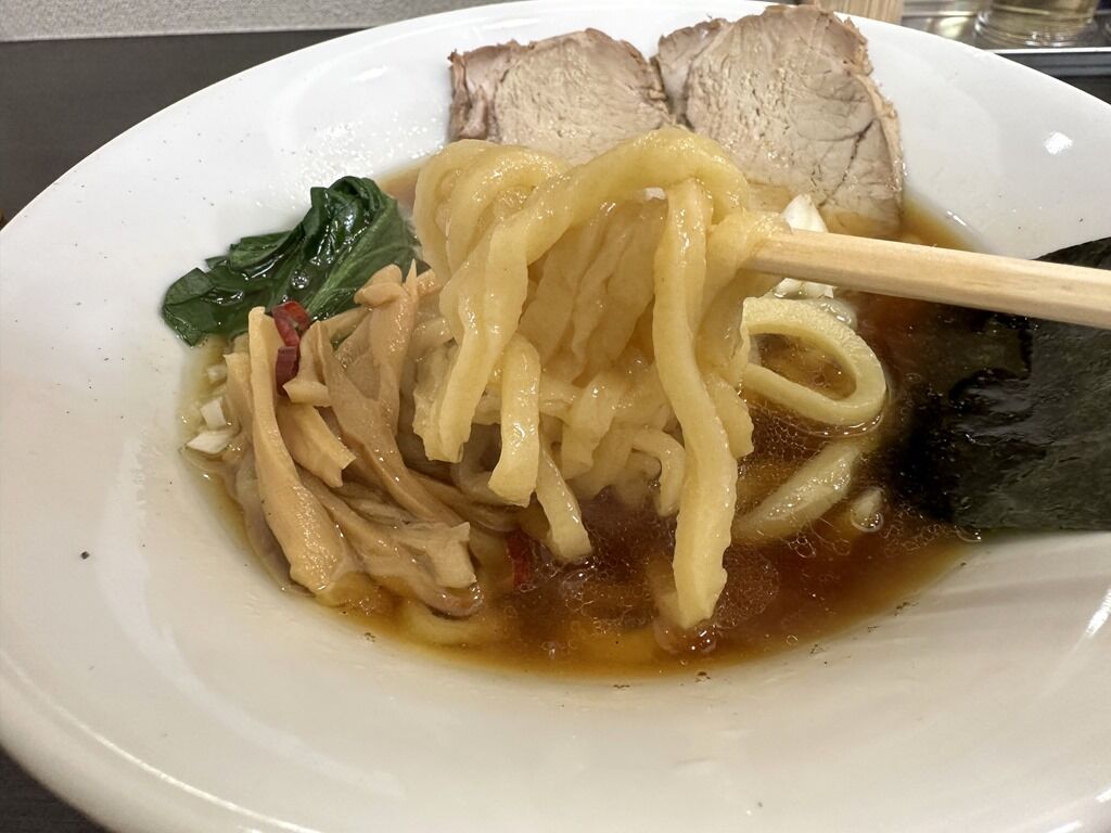 スープはさらさらの無化調清湯醤油味。1ロット3杯ですが1杯ごと小鍋で加熱で、小鍋を同時に3つ使用。煮干主体の魚介が前面に出て動物性が下支えする構成。出汁の存在感が鮮烈で濃密、立体感と迫力があります。醤油タレ強めですが、キレのある出汁と絶妙なバランスを誇示。以前いただいた時は牛脂と貝柱の香味油に白醤油のタレで、味が異なり比較出来ませんが、感覚的に数段レベルアップされてる感じ。行列も納得のハイパークオリティですごく美味しい!