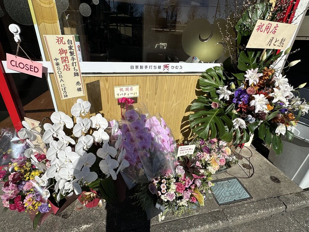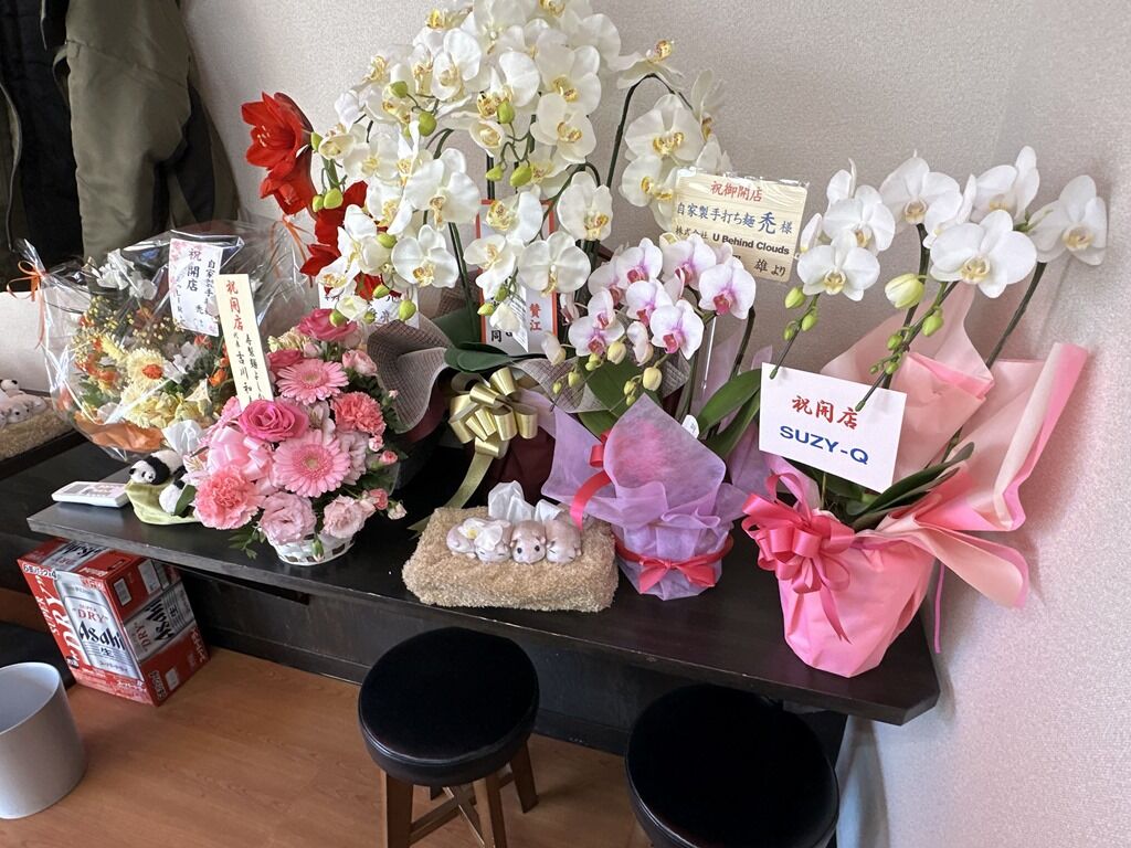 南向きの店舗は陽が当たってポカポカ、待ちもさほど寒くありません。店頭開店祝花・胡蝶蘭はとんちぼ、中華SOBAにぼ乃詩、他から。