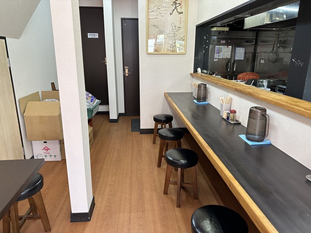 定刻ちょうどにオープン。店内は厨房前に真っ直ぐなカウンター5席、2人卓x1。もう1卓はコップ・レンゲ・ピッチャー・箱ティッシュ置き場、別な1卓は花置き場になっていて未開放。