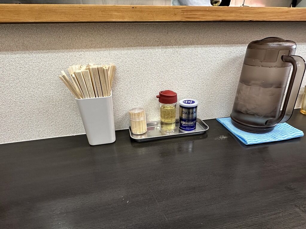 BGMはJ-POP。箸は割り箸。卓上調味料は酢、GABANブラックペッパー。