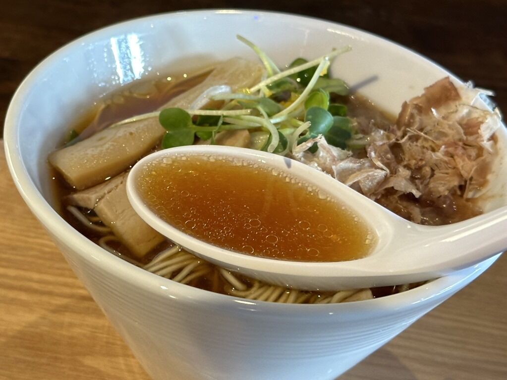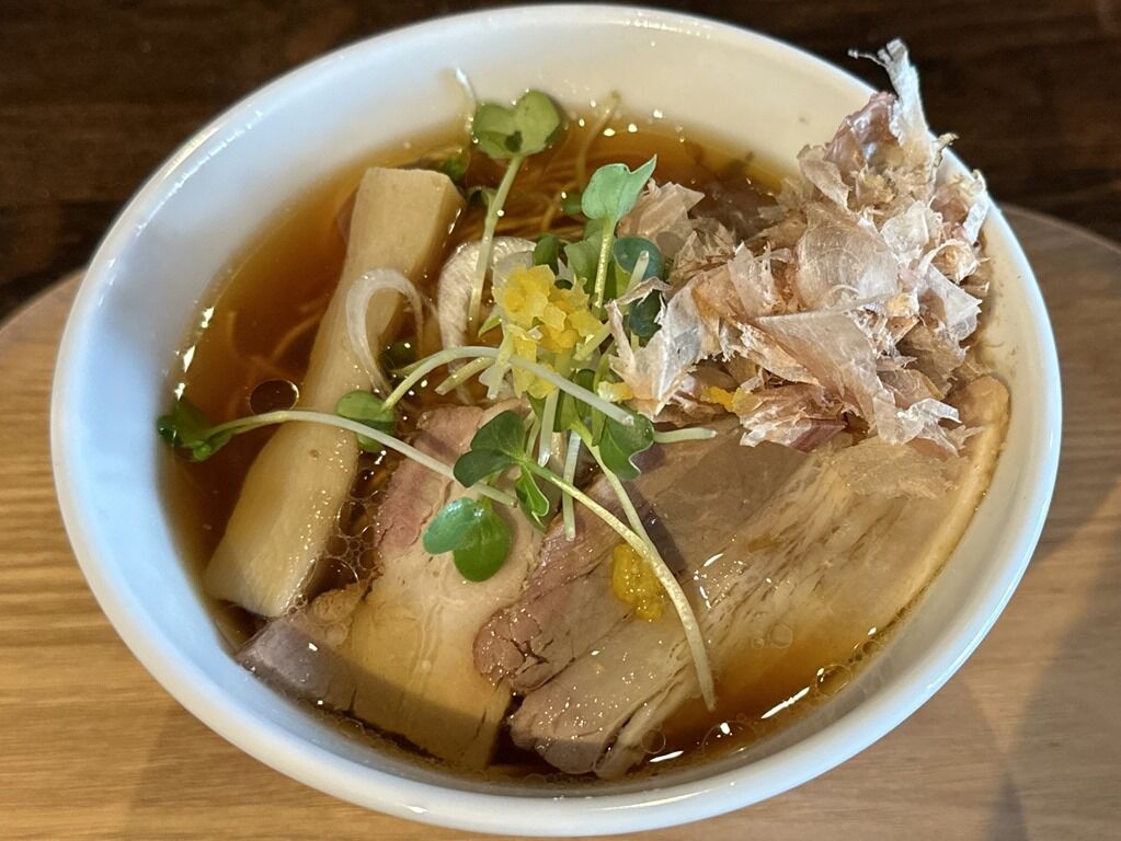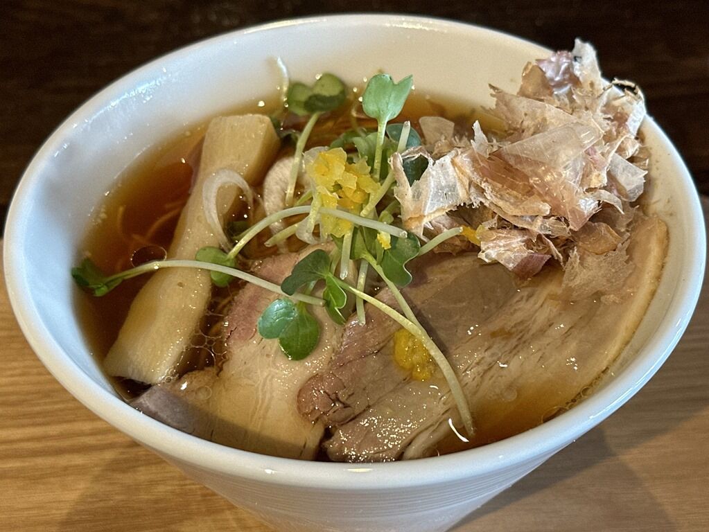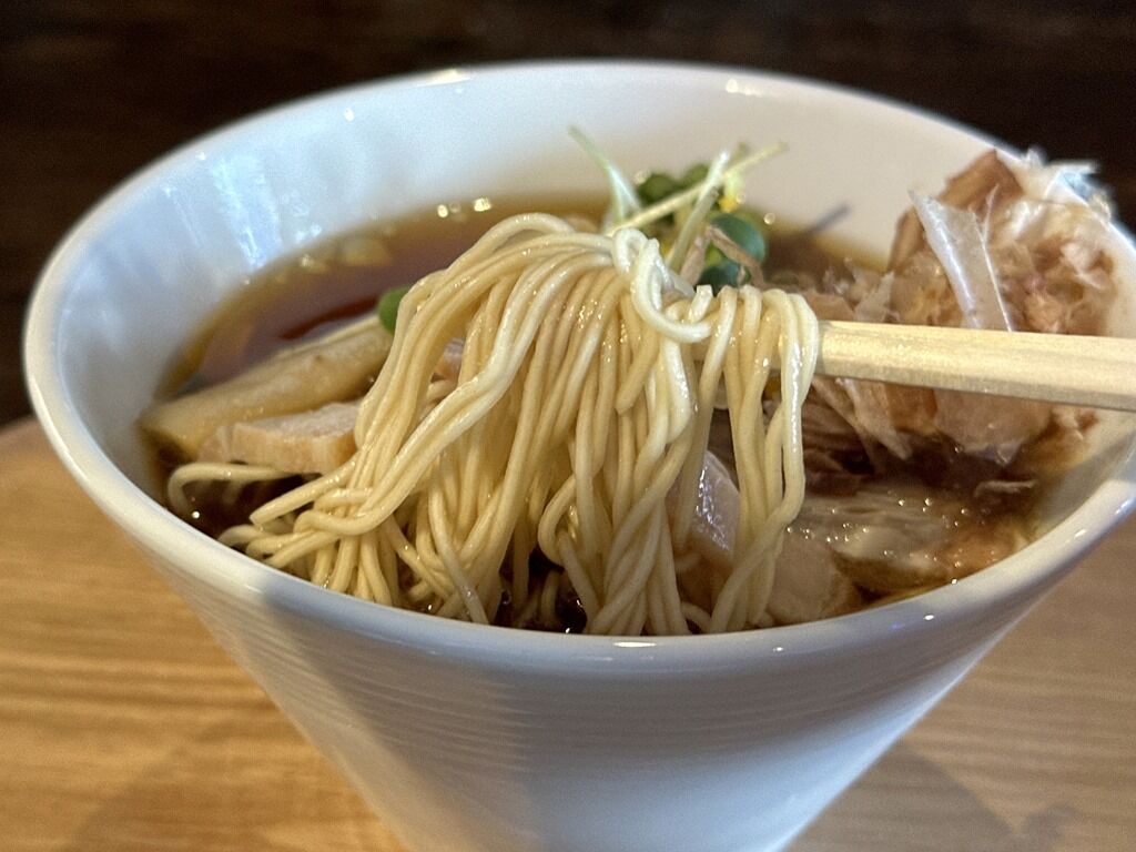 スープはさらさらの清湯醬油味。蕎麦やうどんにも合いそうな節の効いた和風出汁、少し甘めであっさりさっぱりな朝らしい一杯。柚子が効果的に効いて、清涼感と華やかさを添えます。