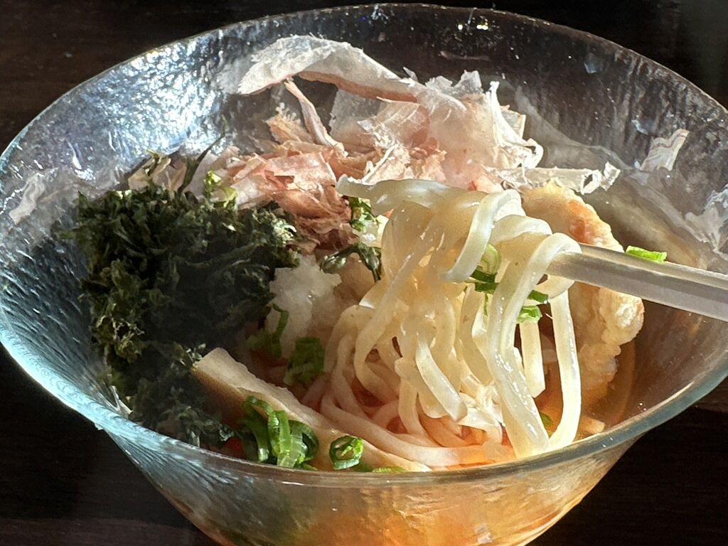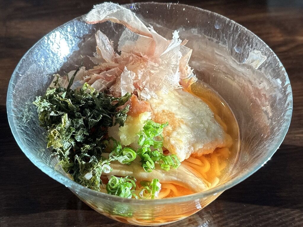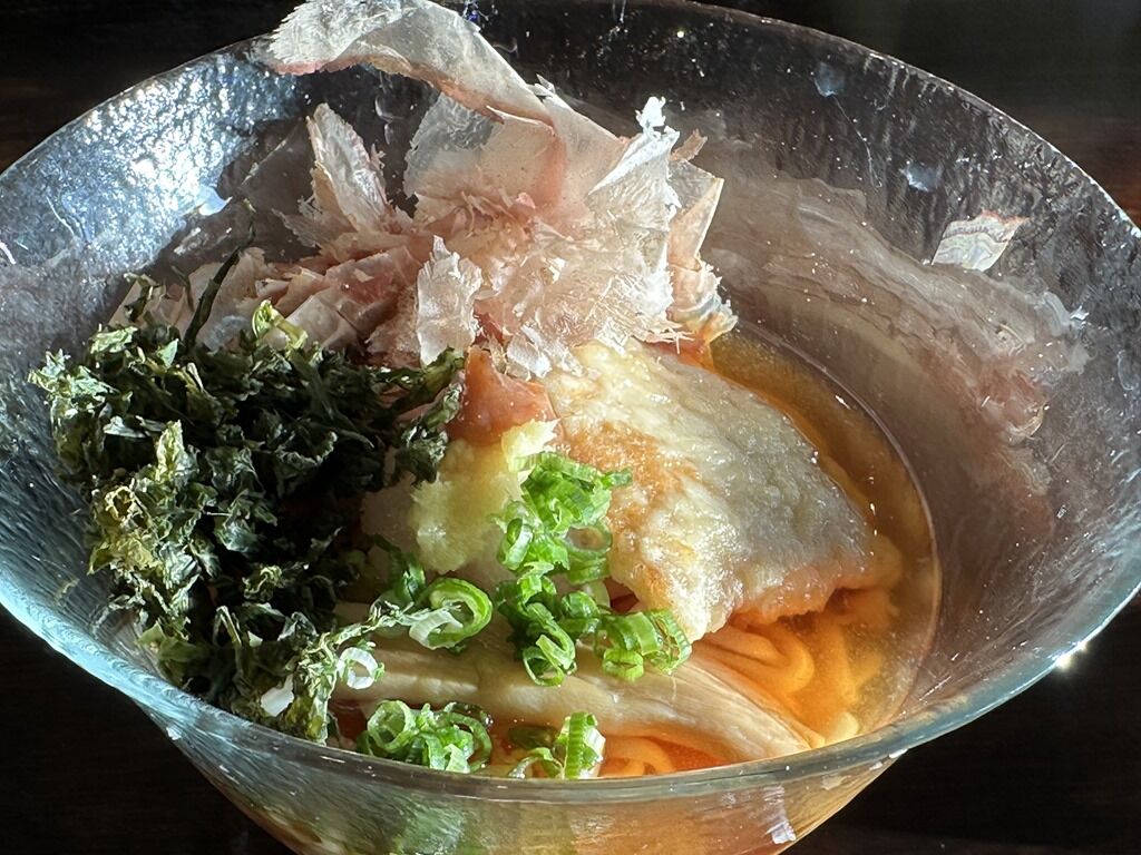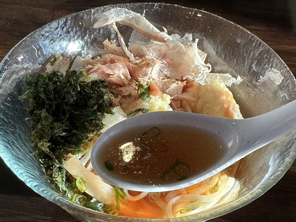 スープはやはりかつお出汁の清湯醤油味。冷え冷えでの提供。大根おろし、梅肉、生姜で温よりもさらに和テイスト。温かいかしわ天が冷製スープと見事にマッチしてちょっと感動する旨さ。