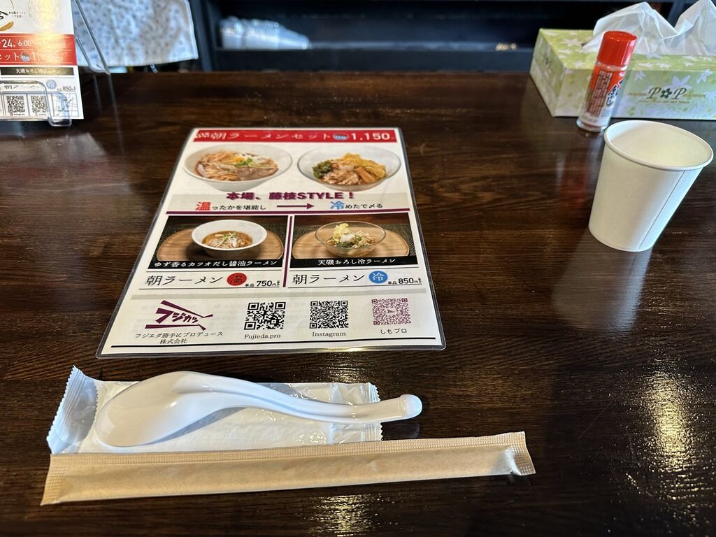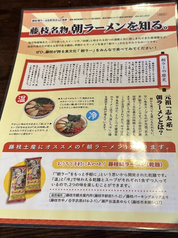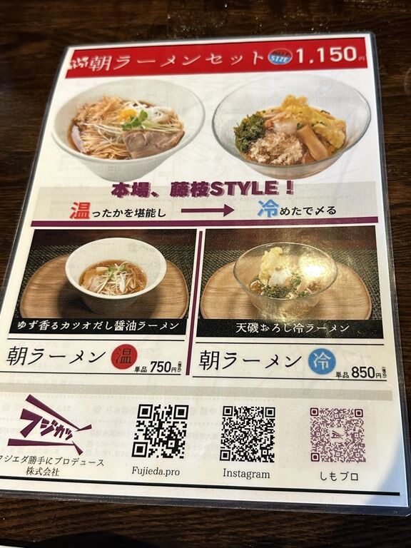 券売機は無く先会計制。メニューは、ゆず香るカツオだし醤油ラーメン750円、天磯おろし冷ラーメン850円、朝ラーメンセット1150円、(お土産)藤枝朝ラーメン500円。