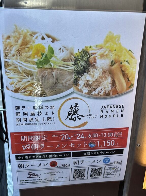 2024年1月20日オープン。マツコの知らない世界「朝ラーの世界」でも紹介された、静岡県藤枝市独特の食文化(ラーメンカルチャー)「朝ラーメン」(温冷2杯セット)が、期間限定ながら東京初進出。朝ラー好きとしては行かねば!