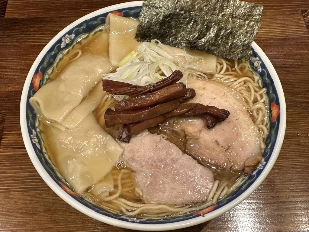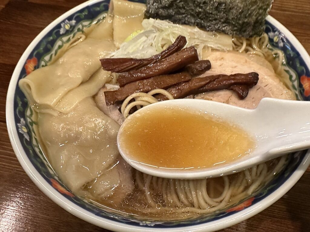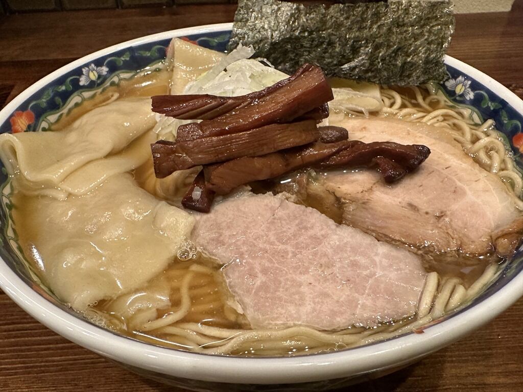 具はチャーシュー2枚、濃い茶色のメンマ、ワンタン、海苔、小口切りねぎ。ワンタンはもち姫使用とのとで、皮がすんごいもっちもち。てるてる坊主みたいに餡のところをキュと絞るのではなく、正方形の皮の中央に餡を置いて、皮を4つに畳んで完成。超もちもち皮に加えて、生姜の効いたジューシーな肉餡がまた美味。