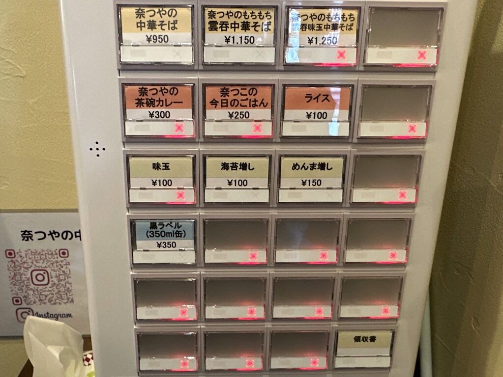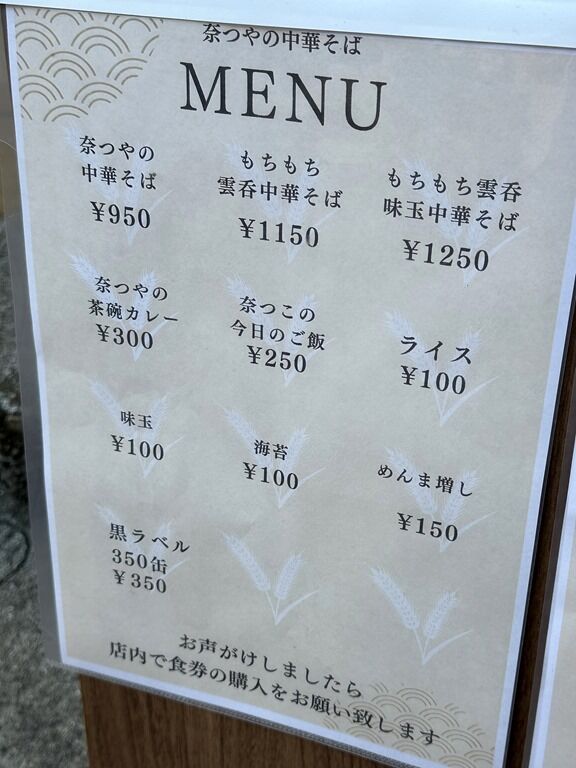 主なメニューは、奈つやの中華そば950円、もちもち雲呑中華そば1150円、もちもち雲呑味玉中華そば1250円、奈つやの茶碗カレー300円、奈つこの今日のご飯250円、ライス100円、味玉100円、他。