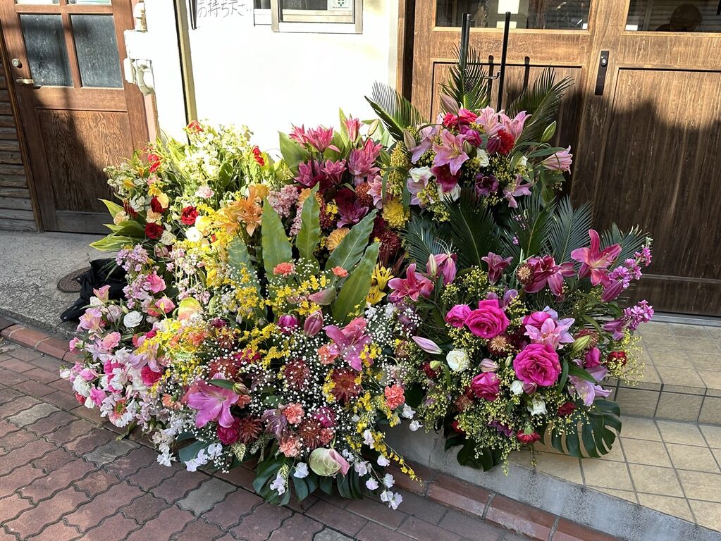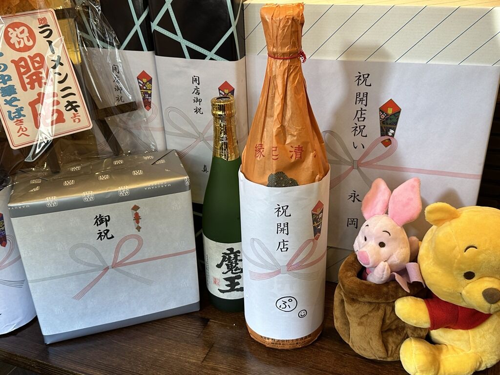 13:30頃到着で店内満席外待ち19に接続。外待ち席は9席。店頭にご自由にお持ちくださいと大量のお花。当初は、麺処びぎ屋、中華蕎麦 とみ田、麵処有彩、菅野製麺所、他からの開店祝花があったようです。暖簾もびぎ屋からの寄贈品。