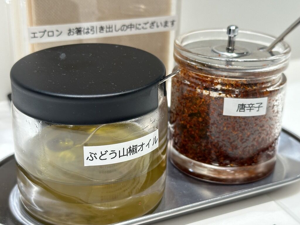 ヒルズ館内BGMは軽音楽。卓上調味料はぶどう山椒オイル、唐辛子。