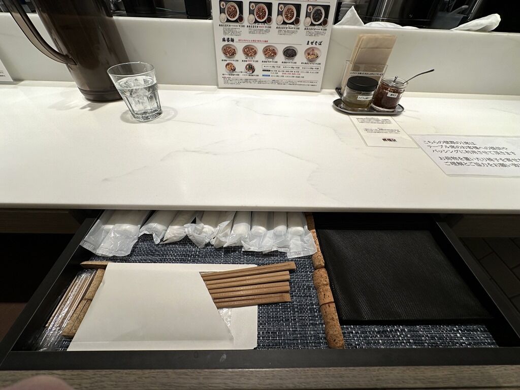 割り箸、箸置き、紙エプロン、ウェットティッシュ、爪楊枝は引き出しの中に。