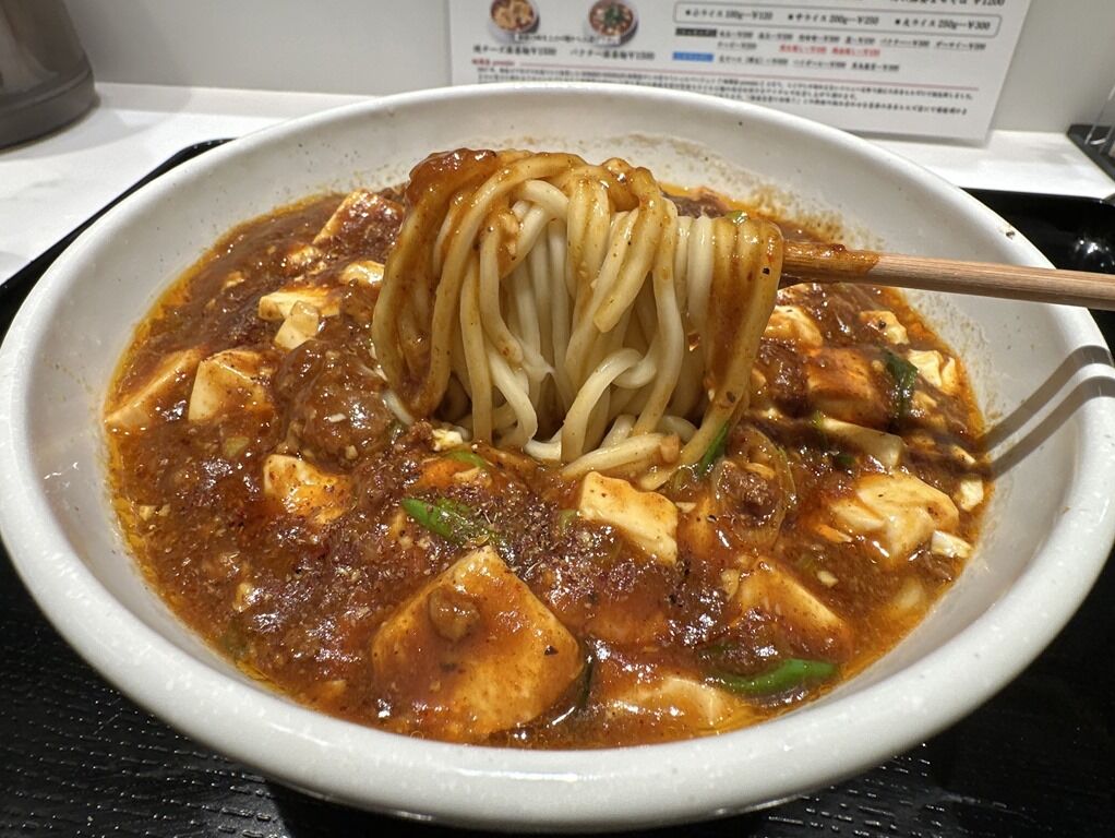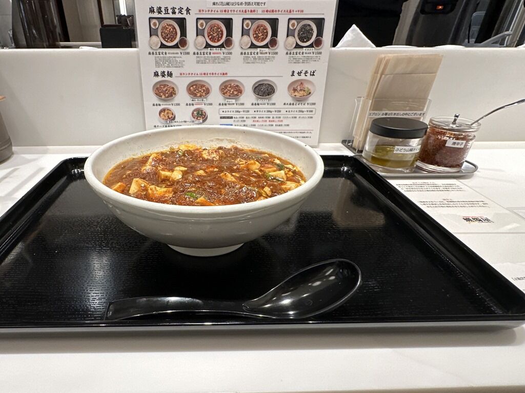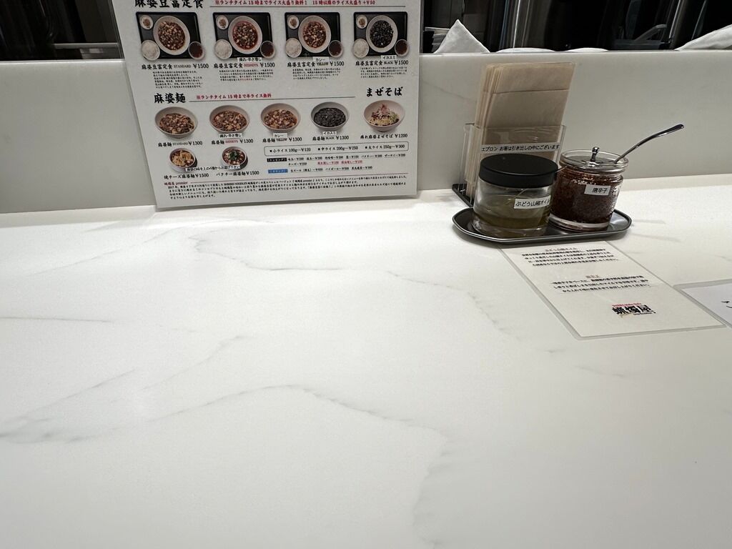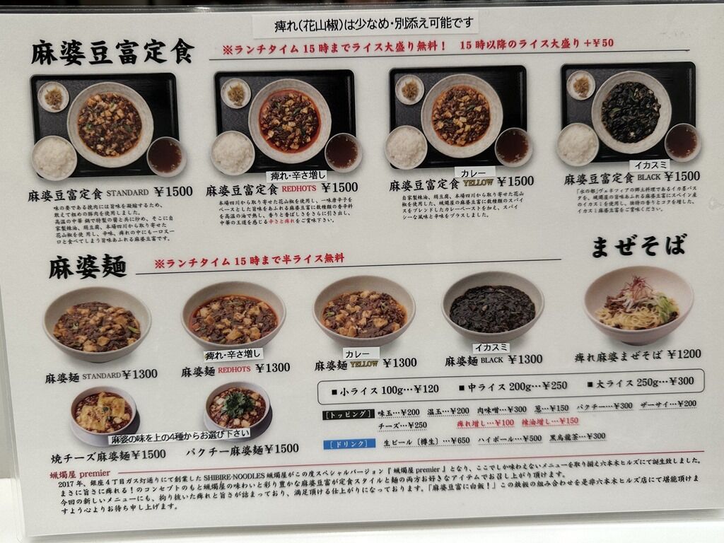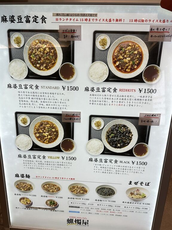 券売機は無く後会計制。主なメニューは、麺メニュー麻婆麺STANDARD・麻婆麺REDHOTS・麻婆麺YELLOW・麻婆麺BLACK各1300円、痺れ麻婆まぜそば1200円、定食が麻婆豆腐定食STANDARD・麻婆豆腐定食 REDHOTS・麻婆豆腐定食 YELLOW・麻婆豆腐定食 BLACK各1500円、他。