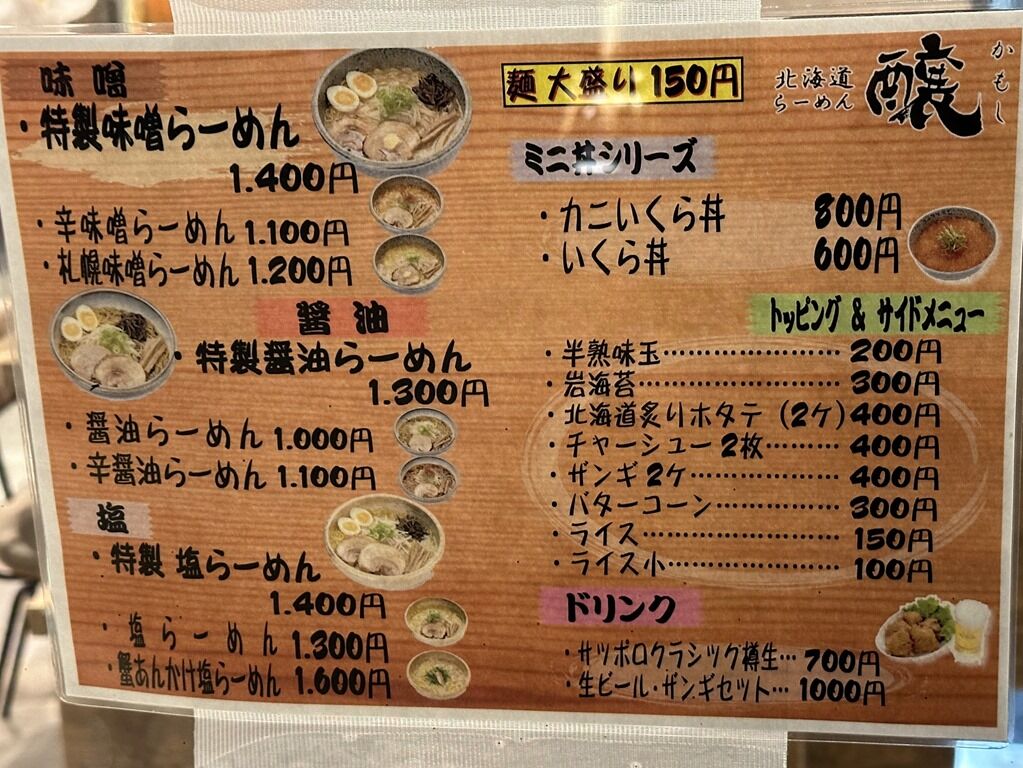 というわけで1Fの「北海道ラーメン 醸」へ。北海道月寒で人気の名店「鶏soba KAMOSHI」の新ブランドだそうです。