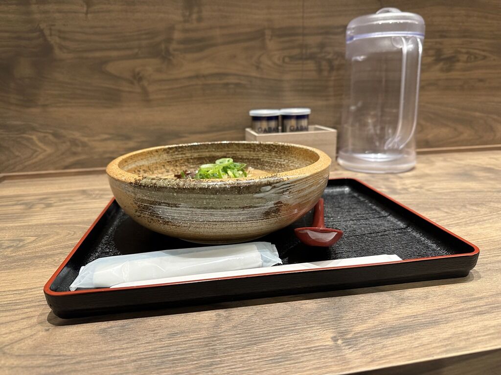 注文から約2分の超速で提供。背が低く開口部の広い土鍋的で特徴的なボウル型の器で着丼。