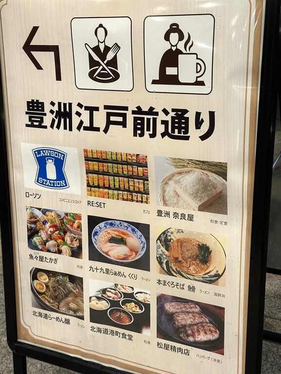 「豊洲 千客万来」の場所は、ゆりかもめ市場前駅からペデストリアンデッキで直結。ラーメン店は1Fに「九十九里らぁめん くくり」、「北海道ラーメン 醸」、「本まぐろそば 䱻」の3店が並んであります。中華そば 豊洲勝本と麺屋 武一は3F。