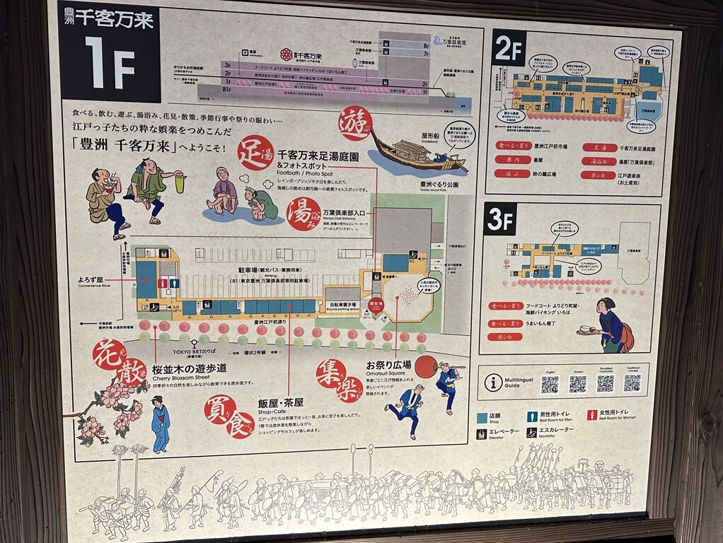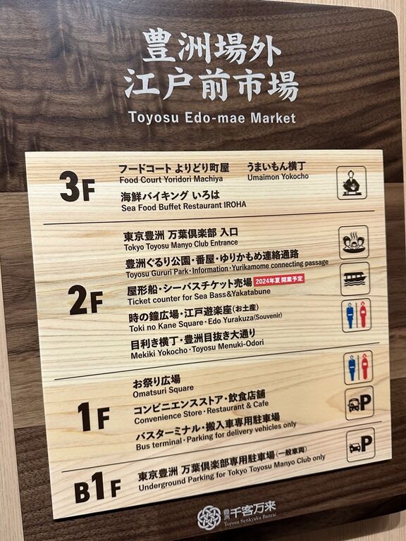 1F〜3Fの「豊洲場外江戸前市場」と、4F〜7Fの温浴棟「東京豊洲万葉倶楽部」で構成。なお、8Fは無料の公園と足湯。