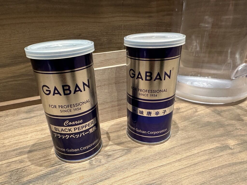 BGMは無し。箸は割り箸。卓上調味料はGABANブラックペッパー・一味唐辛子。
