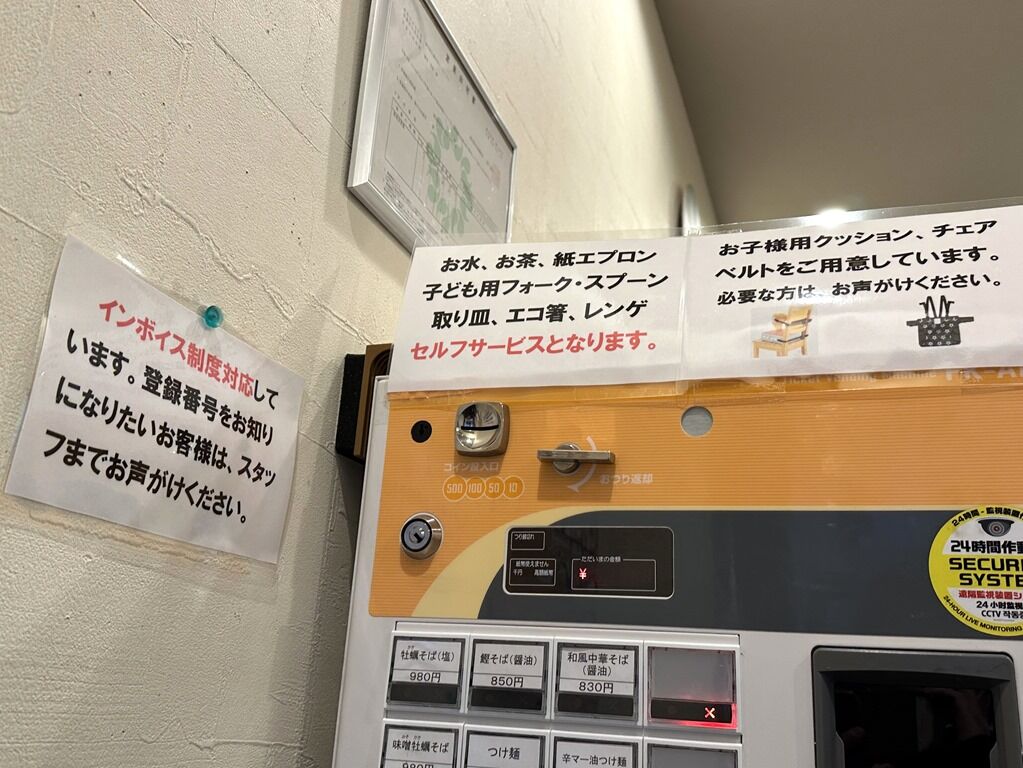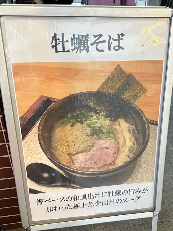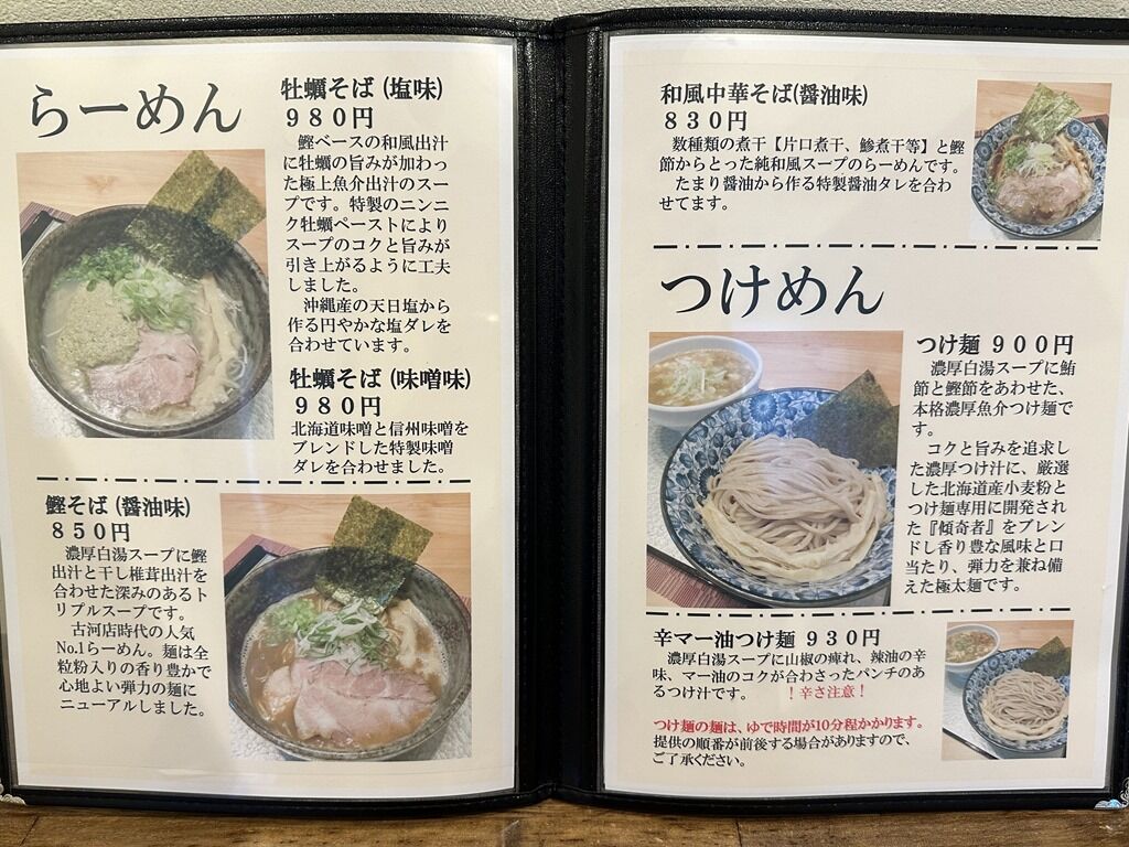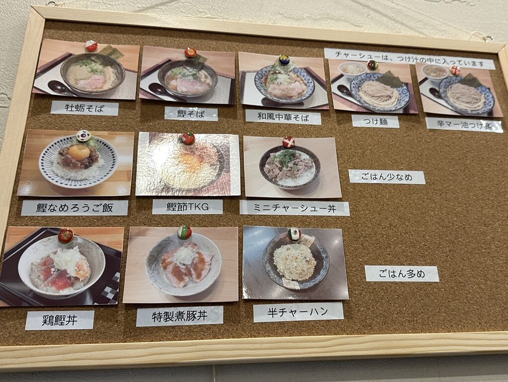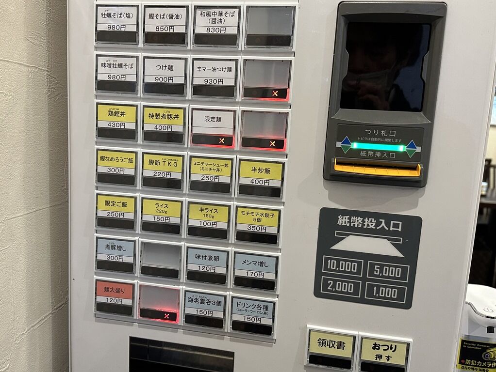 入店するとまず券売機で食券購入です。主なメニューは、牡蠣そば(塩)980円、鰹そば(醤油)850円、和風中華そば(醤油)830円、味噌牡蠣そば980円、つけ麺900円、鶏鰹丼430円、特製煮豚丼400円、鰹なめろうご飯300円、鰹節TKG220円、MINIチャーシュー丼250円、半炒飯400円、他。