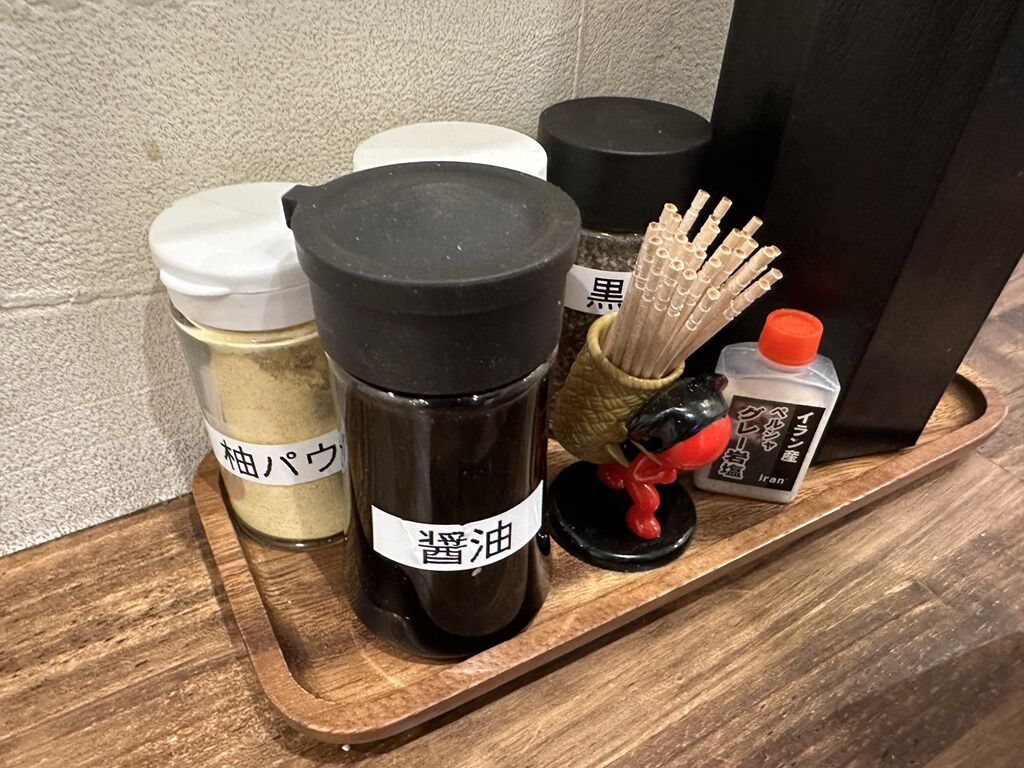 BGMはジャズ。箸は割り箸。卓上調味料は醤油、柚パウダー、一味、黒胡椒、イラン産ペルシャグレー岩塩。爪楊枝入れが籠を背負って歩く人。