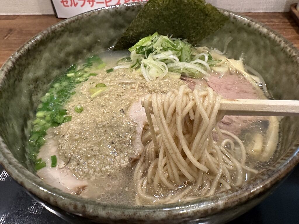 麺は菅野製麺所製のほぼストレート中細タイプ。北海道産小麦に長野県産石臼挽き粉、全粒粉を練り込んだもの。麺量150g。風味豊かで適度なハリとコシ、牡蠣塩スープとの相性もバッチリです。