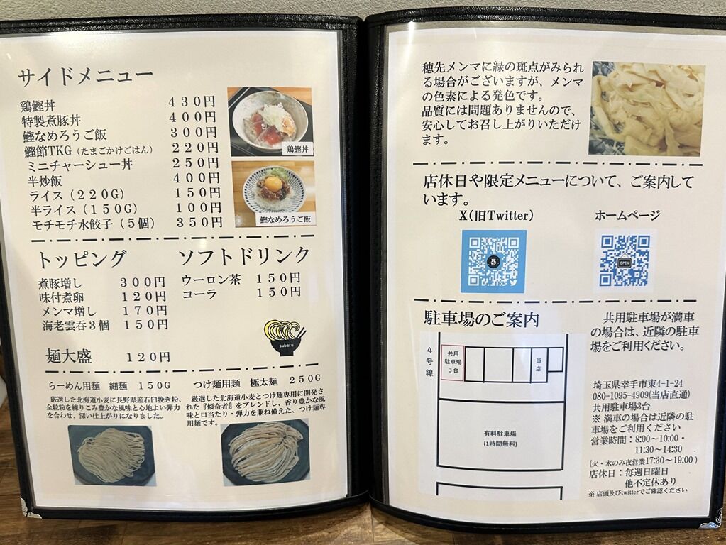 店の場所は幸手駅東口約1.2km。4号線沿い。「生姜醤油ラーメンふたご」と同じ建物で並びの奥。「麺屋 葵」等の跡地。駐車場は共用で3台分あり。