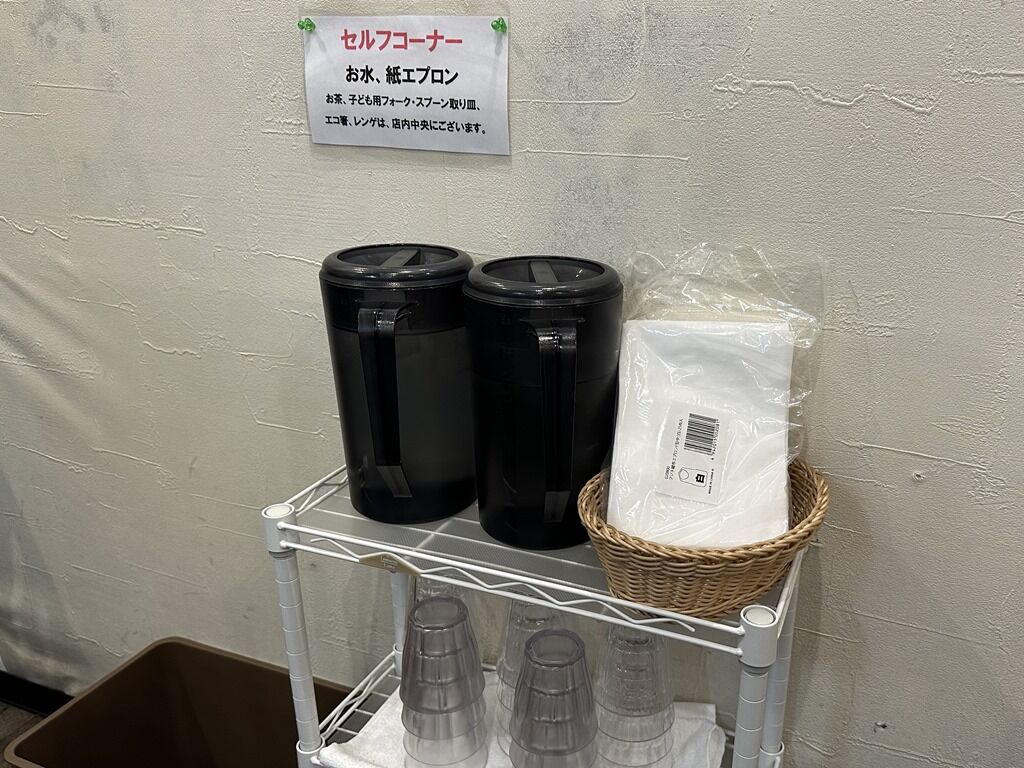 水、お茶、紙エプロン、子供用フォーク、・スプーン、取り皿、エコ箸、レンゲはセルフサービス。子供用クッション、チェアベルトの用意あり。