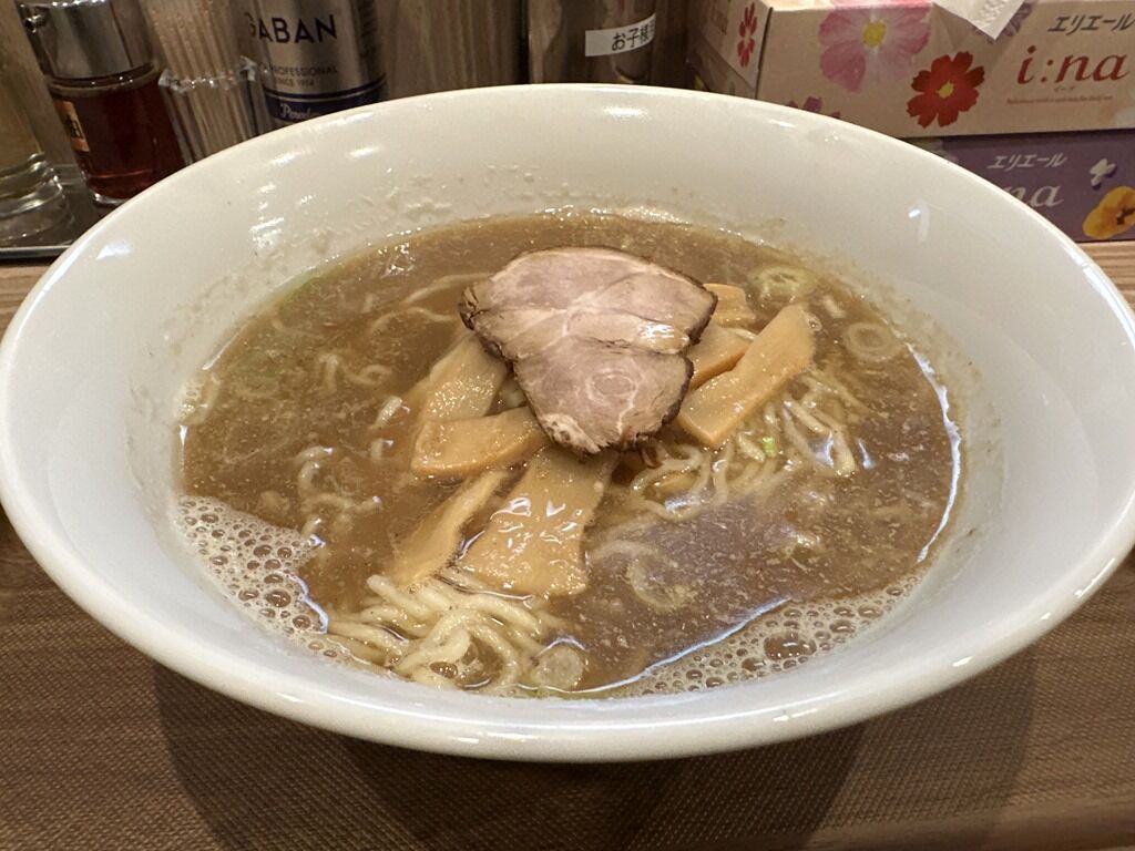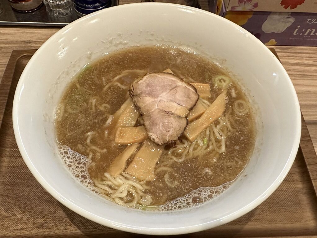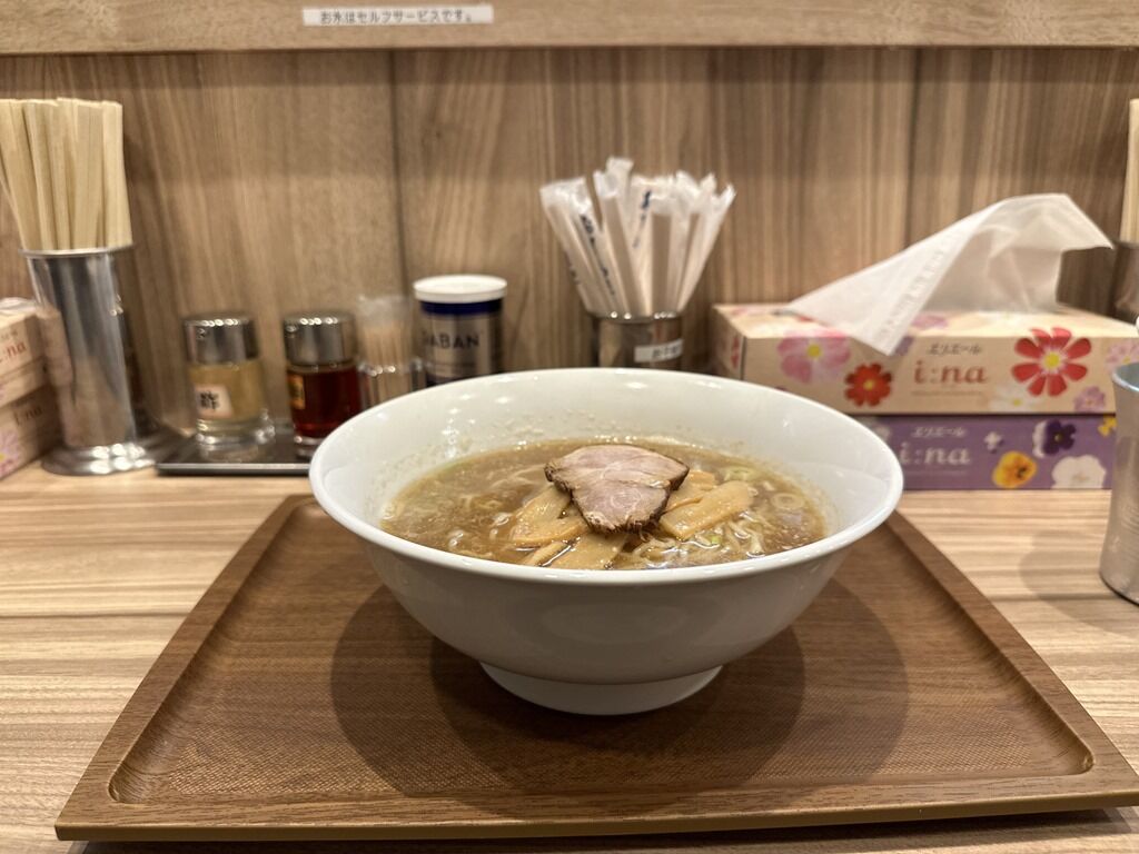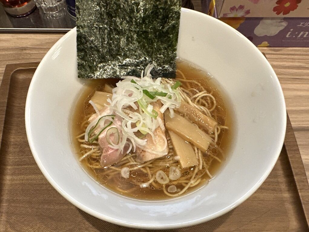 白い切立丼がトレーに載って着丼。メニュー説明書きによると、「じっくりと丁寧に炊きだした鶏出汁。出汁が際立つ特製の醤油。どこか懐かしさを、そして癖になる醤油らーめん。」。