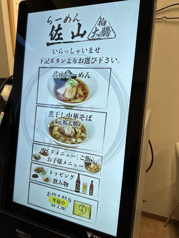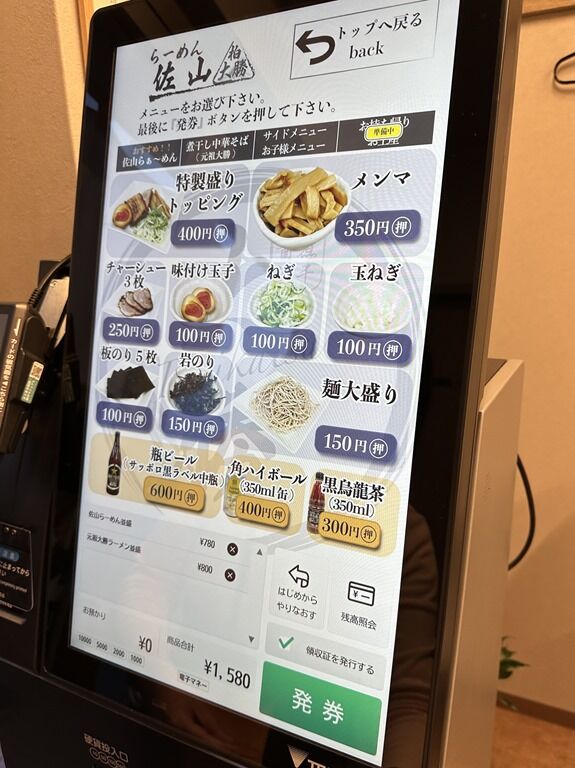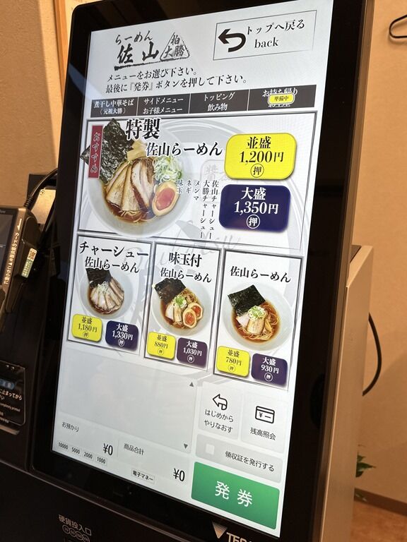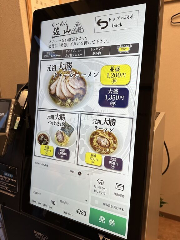 店内入るとまずタッチパネル式券売機で食券購入です。主なメニューは、佐山らーめん780円、元祖大勝ラーメン800円、他。