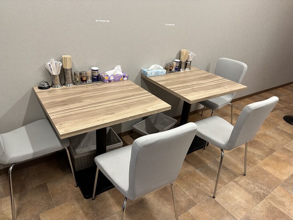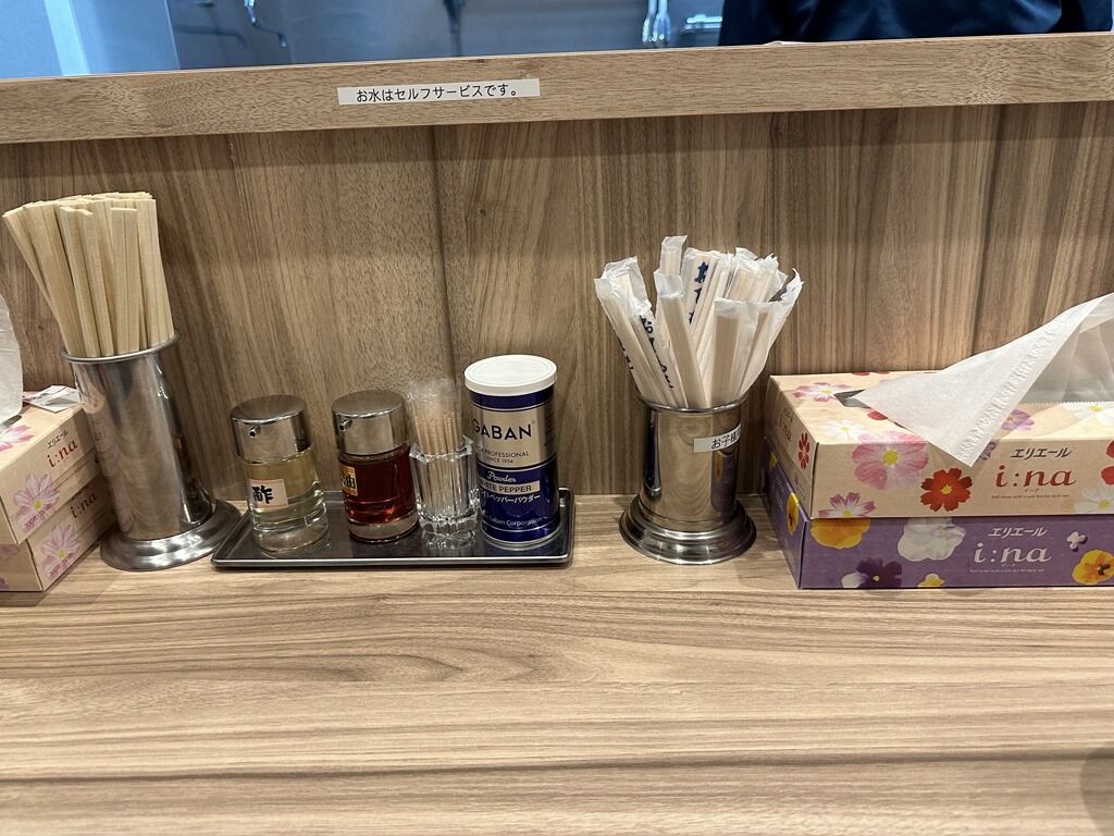 箱ティッシュはカスター横。箸は割り箸。なんとお子様用の短い割り箸用意あり、これは初めてかも!?卓上調味料は酢、ラー油、GABANホワイトペッパー。