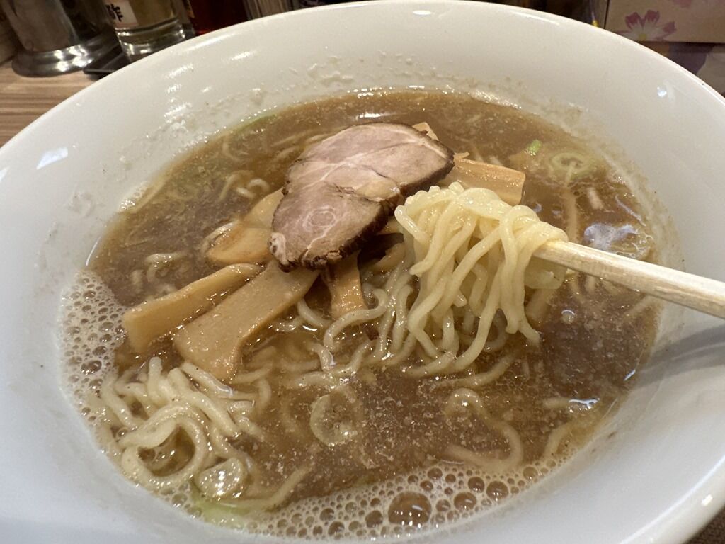 麺は中太縮れタイプ。「佐山らーめん」とは麺を変えてスープとのマッチングを追求。