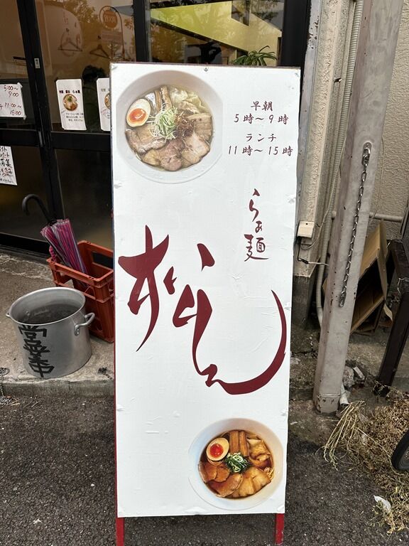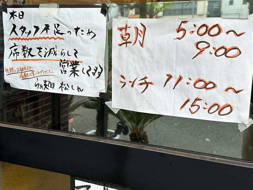 営業時間5:00〜9:00、11:00〜15:00で朝ラーメン可能。