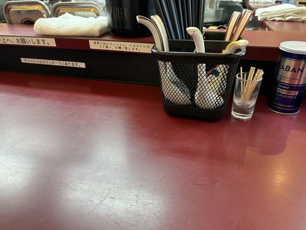 7:10頃到着で先客4、後客4。厨房に店主主さん、ワンオペ体制。麺をテボから平ざるに上げて丁寧な湯切り。箱ティッシュはカウンター下。