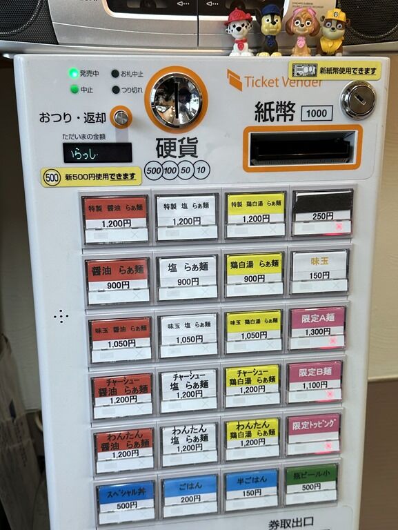 入店するとまず券売機で食券購入です。主なメニューは、醤油らぁ麵900円、塩らぁ麺900円、鶏白湯らぁ麺900円、特製+300円、スペシャル丼500円、他。